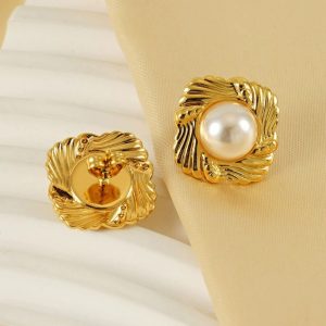 Ατσάλινα Σκουλαρίκια με Ανάγλυφο Τετράγωνο Σχέδιο & Πέρλα