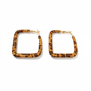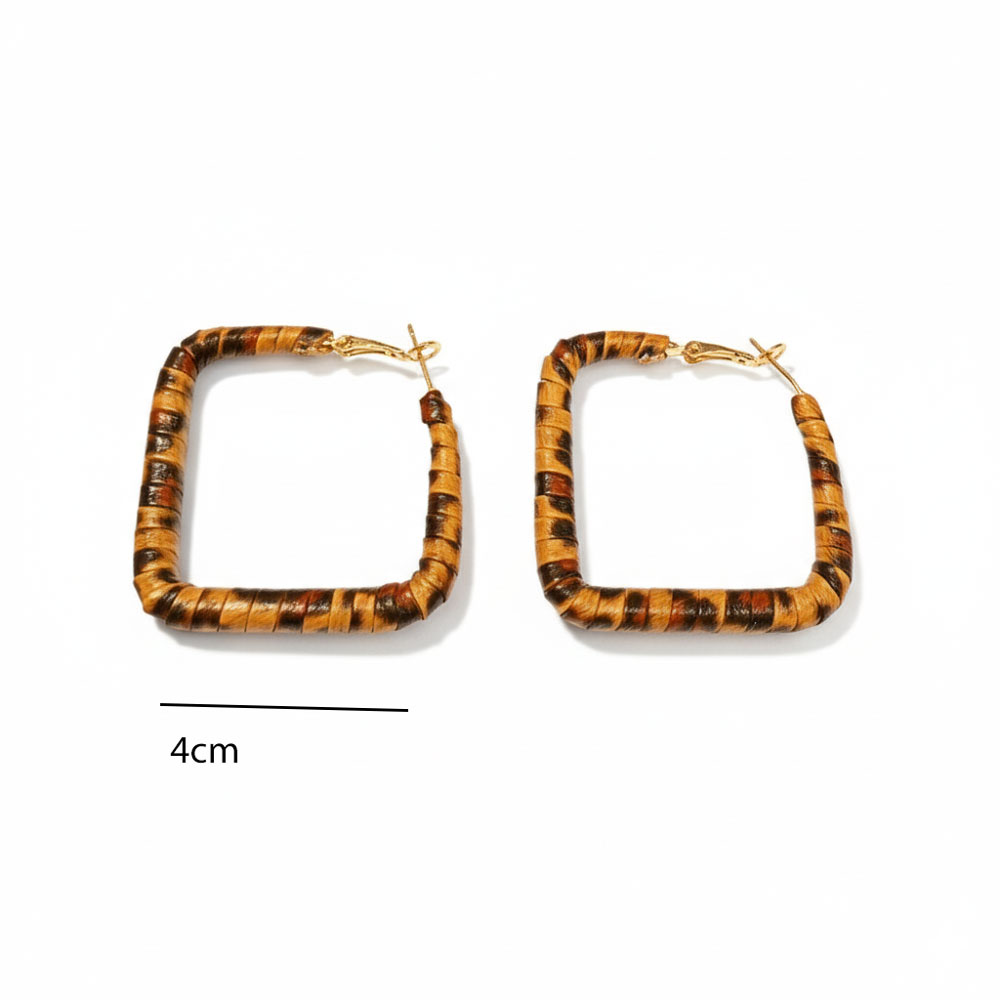 Μοντέρνα τετράγωνα σκουλαρίκια κρίκοι με εντυπωσιακό animal print σχέδιο και ζεστές καφέ αποχρώσεις. Το τυλιγμένο υλικό δημιουργεί μια ιδιαίτερη υφή που δίνει χαρακτήρα και άποψη σε κάθε εμφάνιση. Ελαφριά και άνετα στην εφαρμογή, αποτελούν ιδανική επιλογή για όσες θέλουν ένα statement αξεσουάρ με boho αλλά και chic αισθητική.