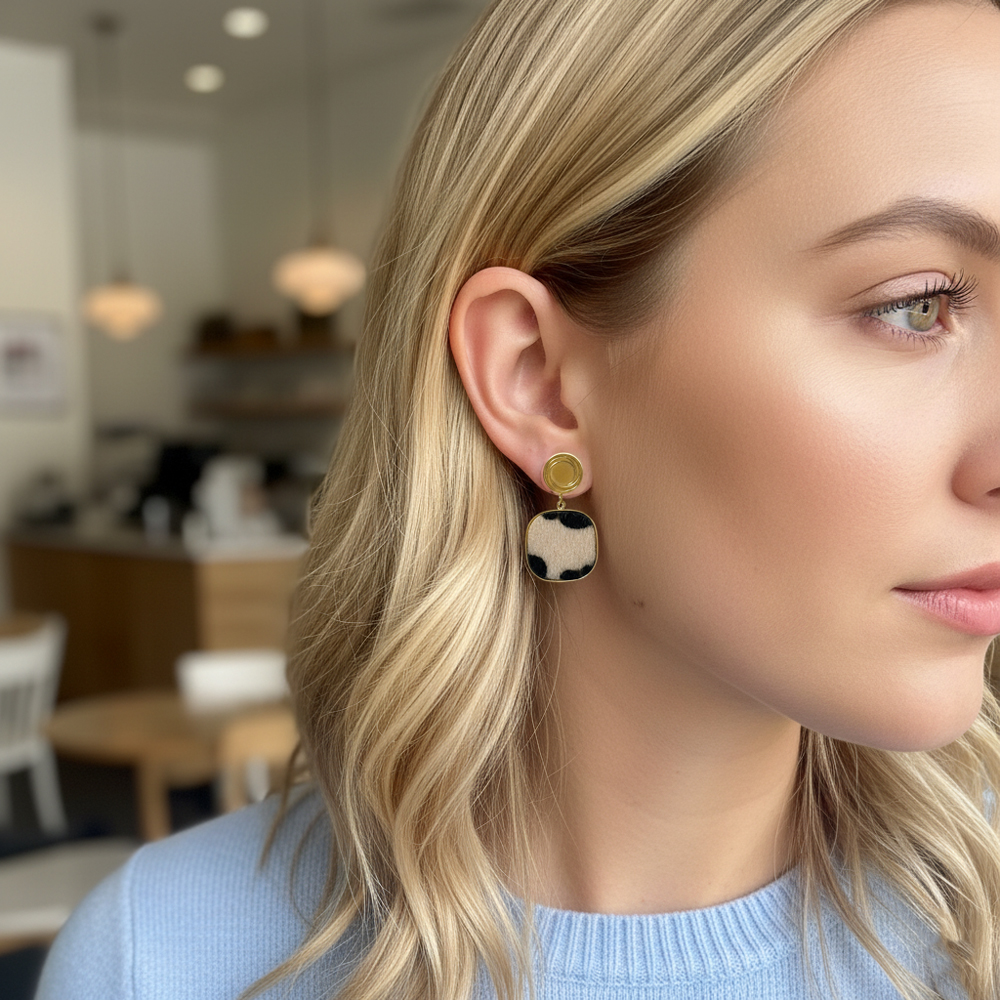 Μοντέρνα ατσάλινα σκουλαρίκια με animal print σχέδιο σε γήινους τόνους. Ο συνδυασμός της χρυσής βάσης με το ιδιαίτερο μοτίβο δημιουργεί ένα δυναμικό και κομψό αποτέλεσμα που τραβά τα βλέμματα. Ιδανικά για καθημερινές και βραδινές εμφανίσεις, προσθέτουν ένταση και χαρακτήρα σε κάθε στυλ. Ανθεκτικά, υποαλλεργικά και ελαφριά για άνετη εφαρμογή.