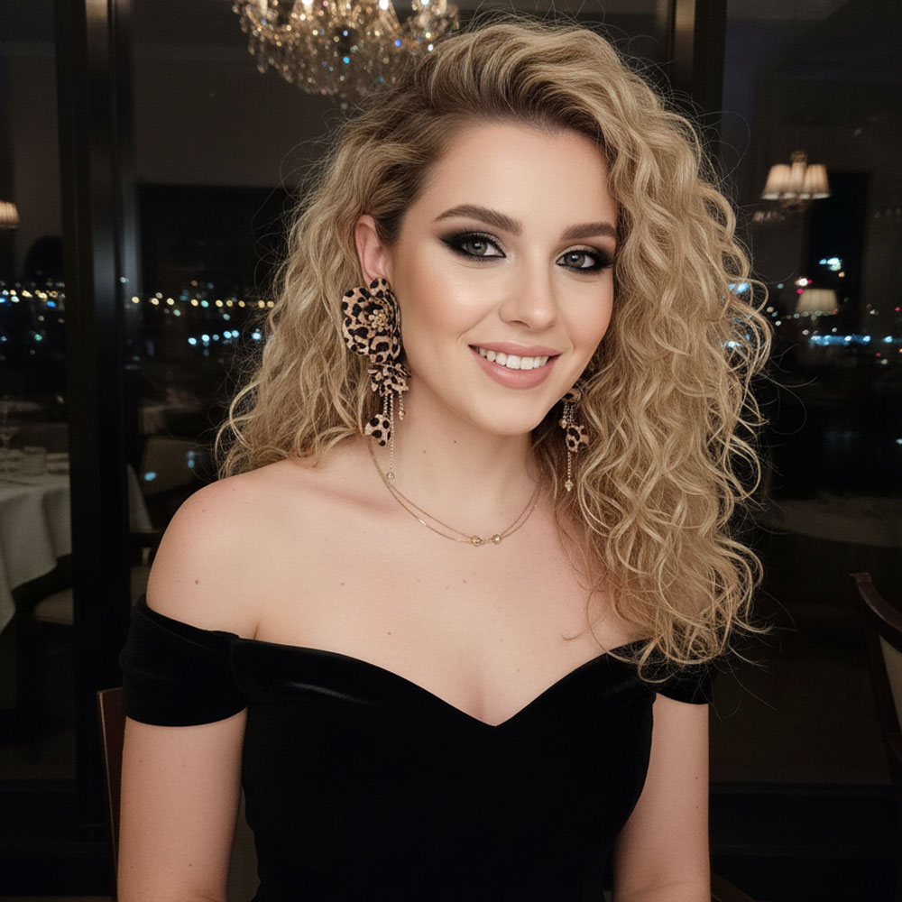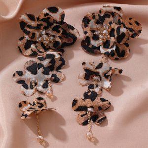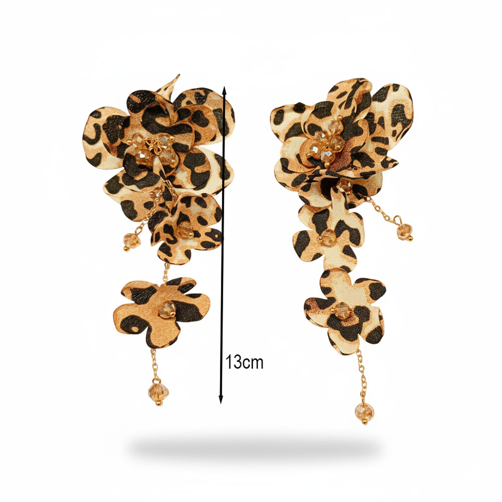 Εντυπωσιακά υφασμάτινα σκουλαρίκια σε λεοπάρ μοτίβο με λουλουδένιο σχέδιο και λεπτομέρειες από κρυστάλλινες χάντρες. Το μήκος τους (13 cm) χαρίζει θεαματική κίνηση, ενώ η ατσάλινη βελόνα προσφέρει ανθεκτικότητα και άνεση. Ένα statement κόσμημα που συνδυάζει το άγριο animal print με τη θηλυκότητα του λουλουδιού — ιδανικό για glam εμφανίσεις και βραδινά looks.