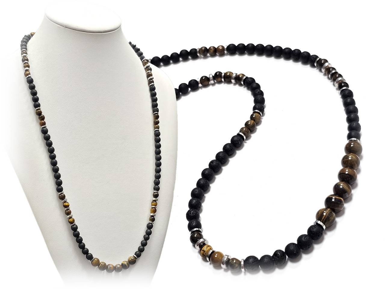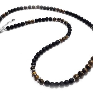 Αντρικό Κολιέ Πέτρα ατσάλι 304, αλυσίδα με λάβα και μάτι τίγρης σε χρώμα Ασημί