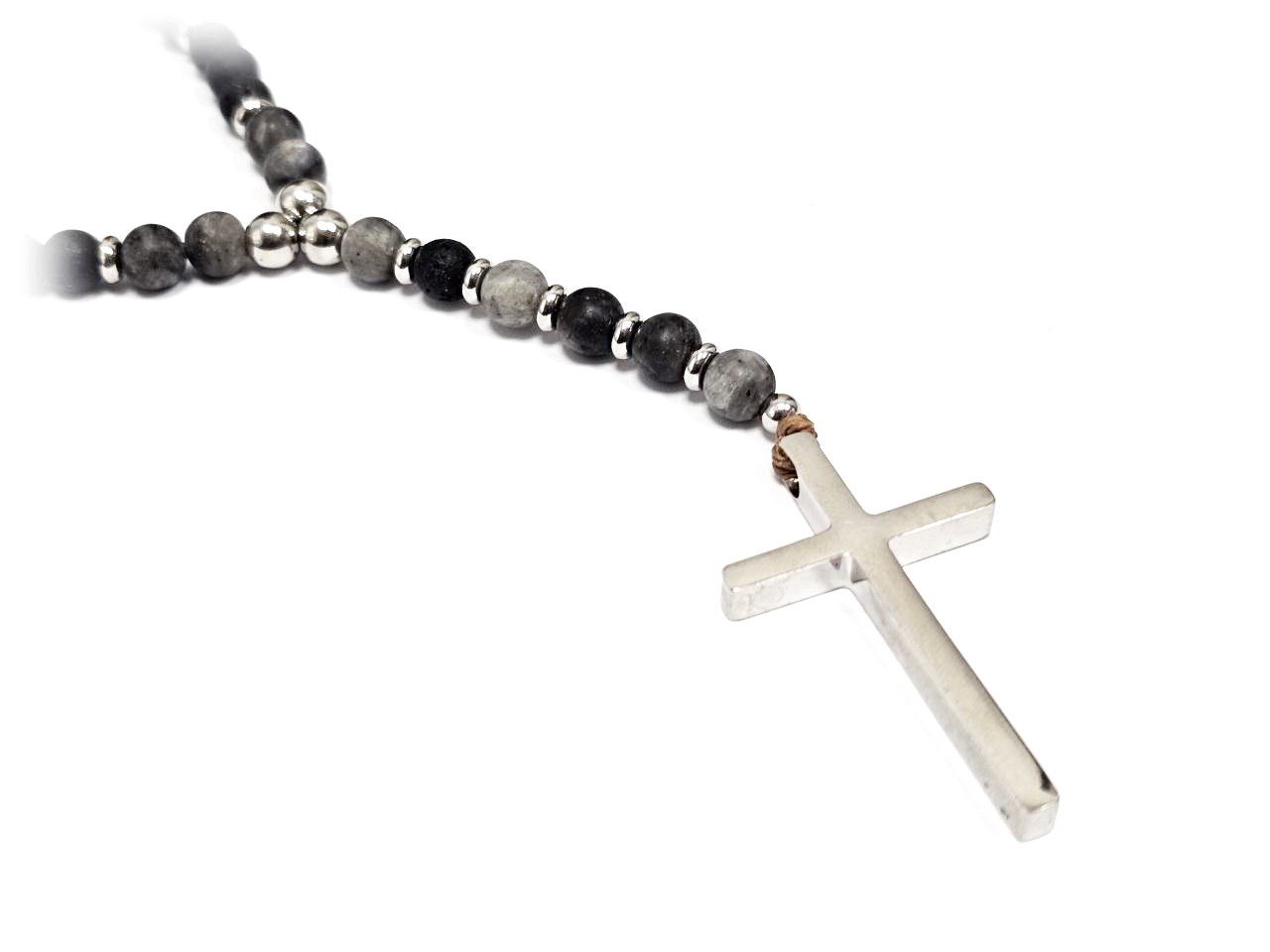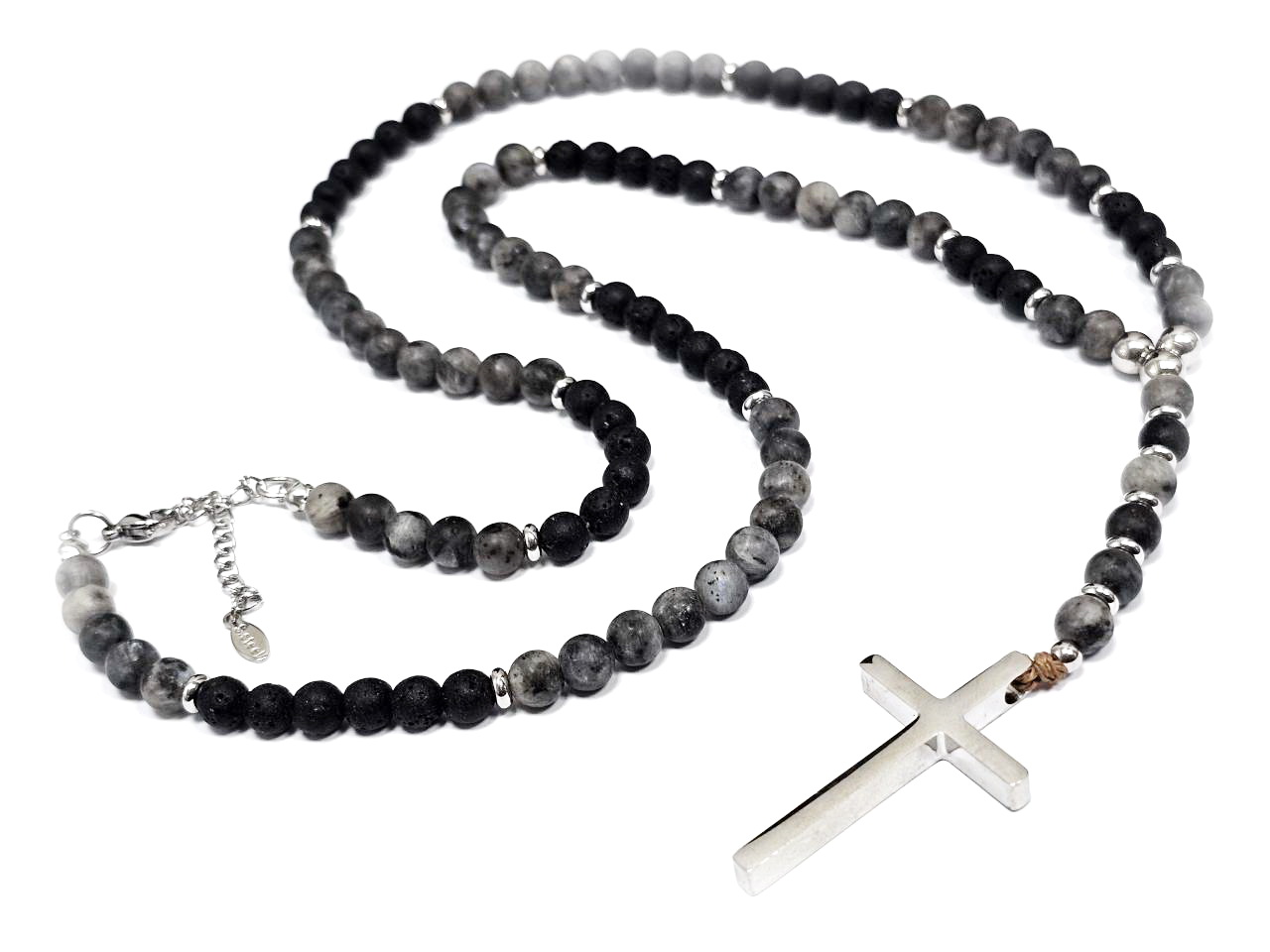 Αντρικό Κολιέ Πέτρα ατσάλι 304, ροζάριο με σταυρό, λάβα και ίασπη σε χρώμα Ασημί