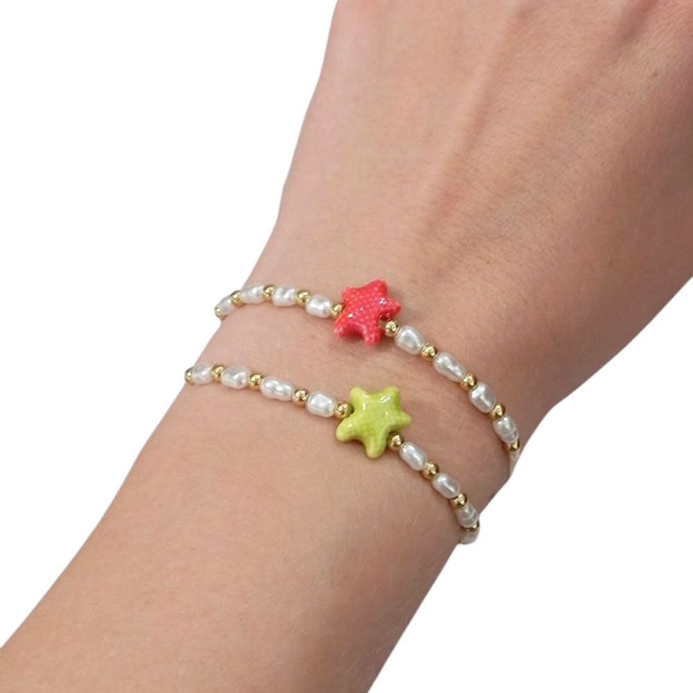 Χειροποίητο βραχιολάκι με χρυσές χάντρες και πολύχρωμο αστεράκιΣε χρώματα όπως λευκό, κίτρινο, κόκκινο, ροζ και μωβΙδανικό για παιδιά, εφήβους ή girly στυλΡυθμιζόμενο μέγεθος – ταιριάζει σε κάθε καρπό