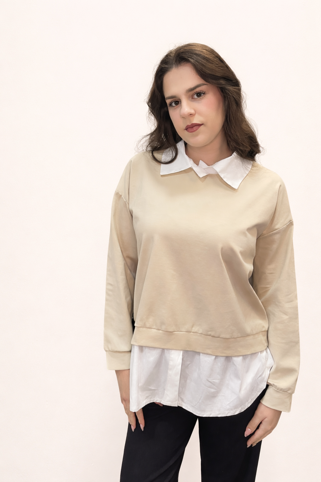 One size μπεζ λεπτή μπλούζα με πουκάμισο μόνο στο τελείωμα της μπλούζας και στα μανίκια. Ιδανική για καθημερινά σύνολα με αθλητικό ύφος.
