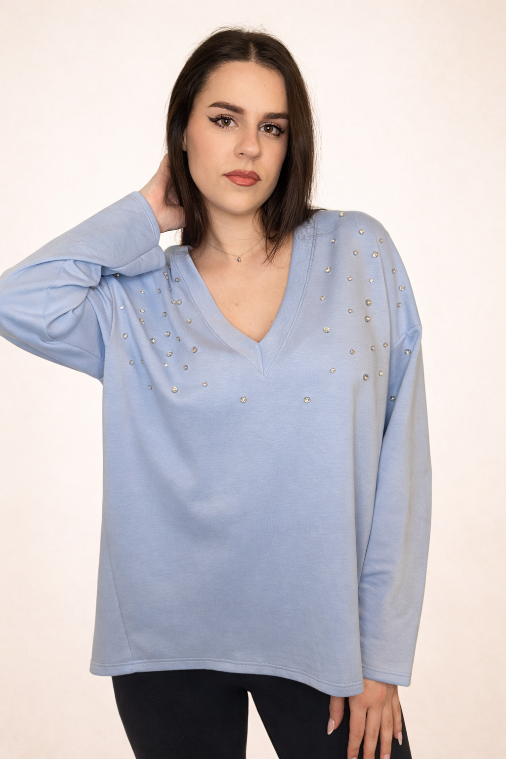 Γαλάζια λεπτή μπλούζα φούτερ με V λαιμόκοψη με διακοσμητικά στρας.