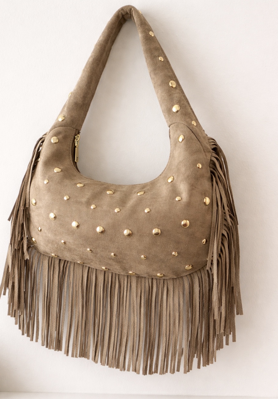 Boho τσάντα ώμου σε suede υφή με κρόσσια και μεταλλικά τρουκς για statement εμφανίσεις.