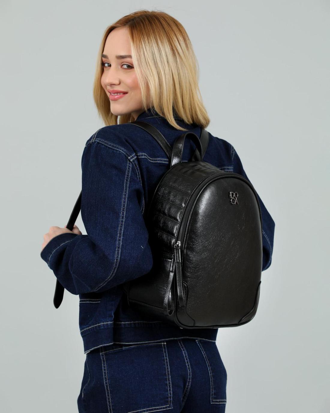 Γυναικεία τσάντα πλάτης σε μαύρο χρώμα με καπιτονέ υφή, εξωτερική τσέπη και ρυθμιζόμενο λουράκι. Κατασκευασμένη από συνθετικό δέρμα.