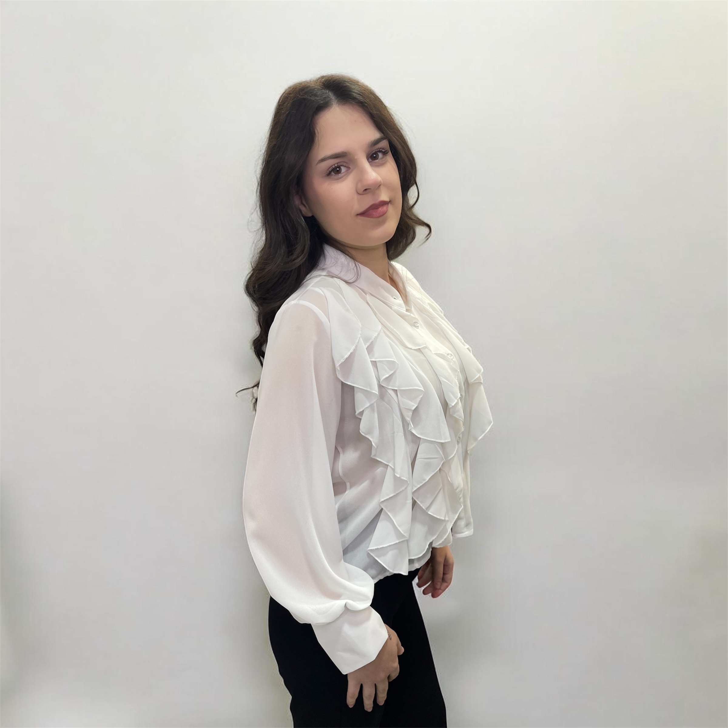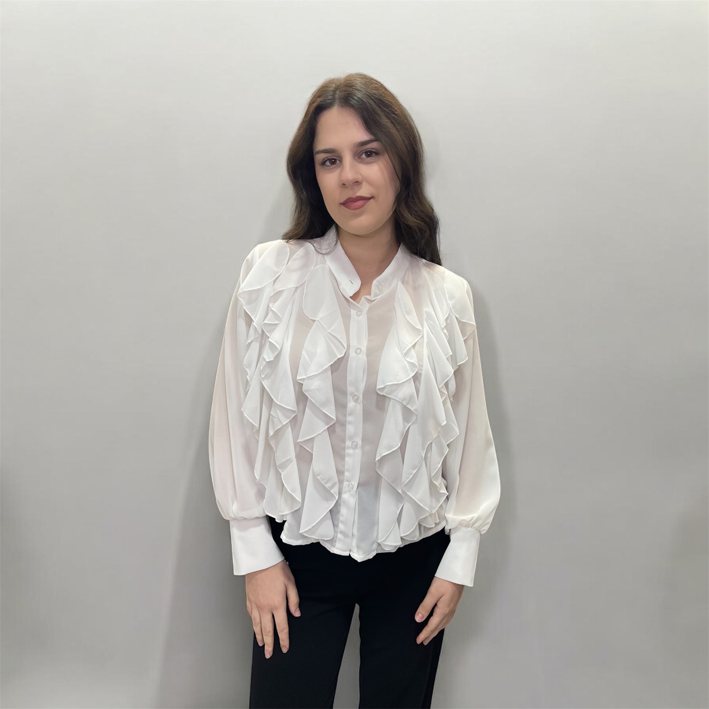 Ρομαντικό λευκό πουκάμισο με εντυπωσιακά βολάν και διακριτική διαφάνεια για κομψές εμφανίσεις.