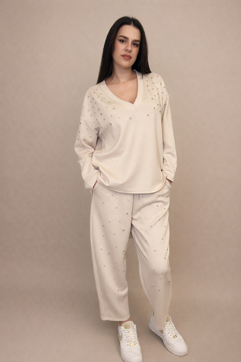 One size μπεζ σετ φόρμας με στρας στην μπλούζα και στο παντελόνι.