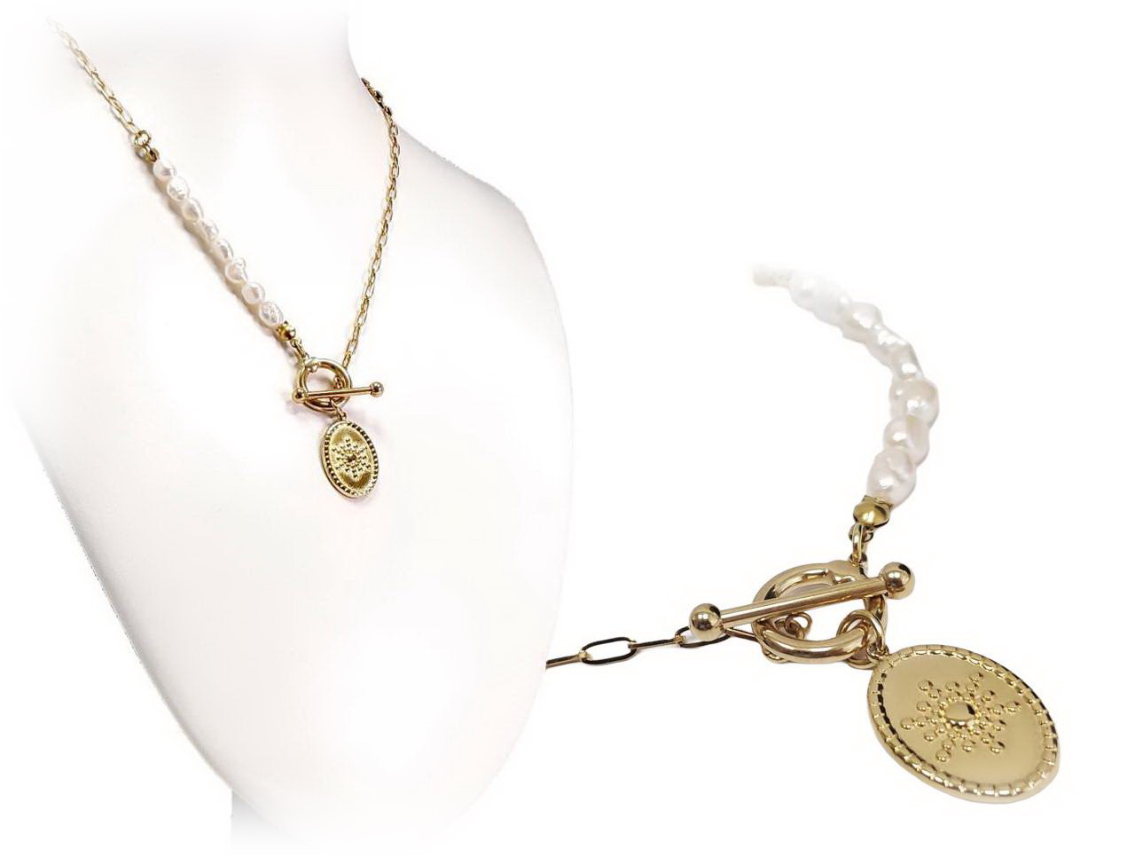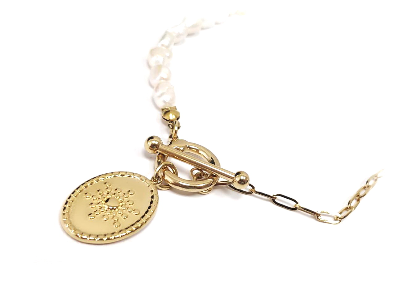 Κολιέ Ατσάλι 316L, αλυσίδα και μαργαριτάρι σε χρώμα Χρυσαφί, Μήκος 40cm