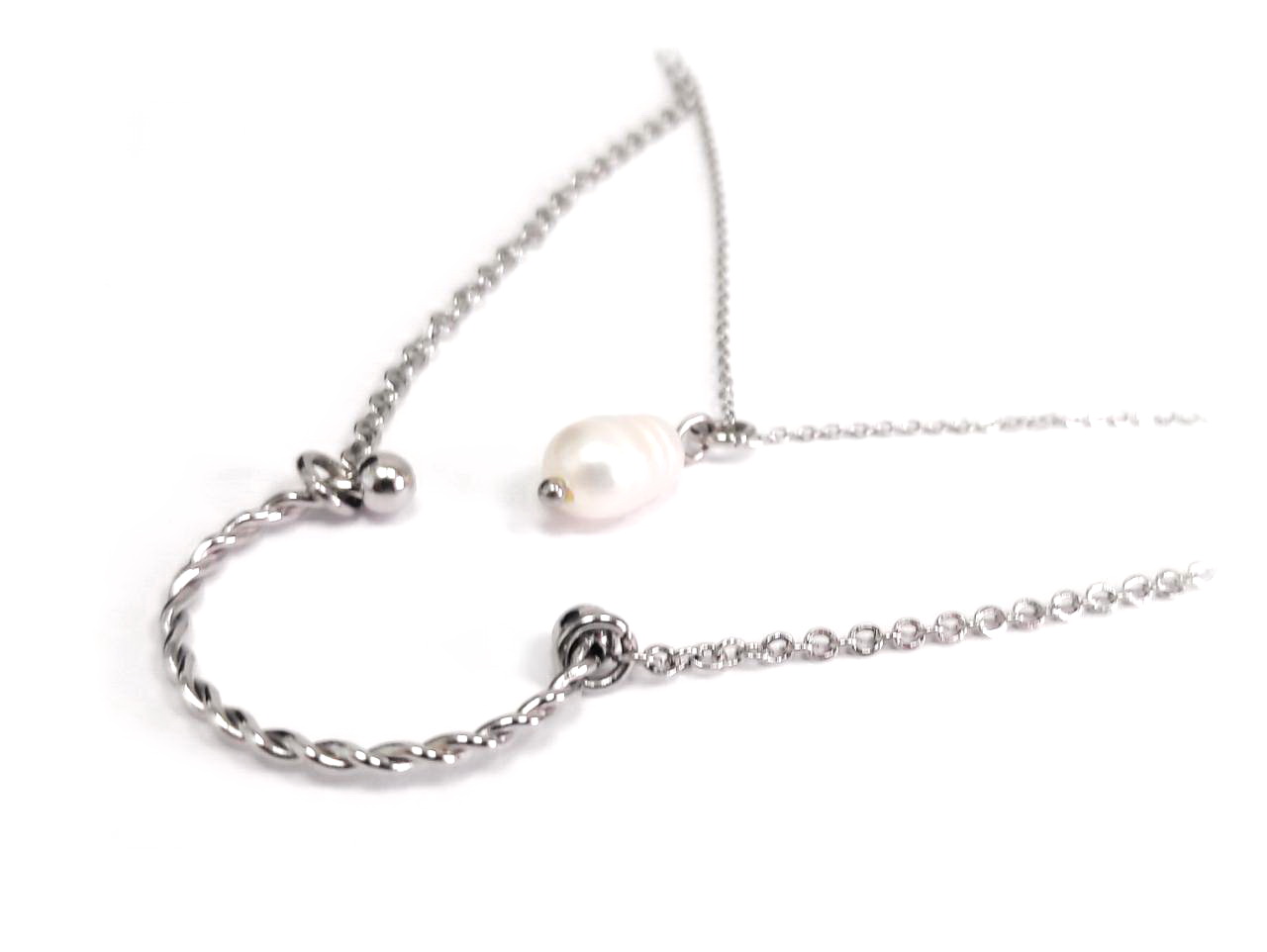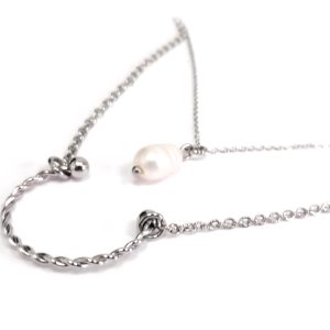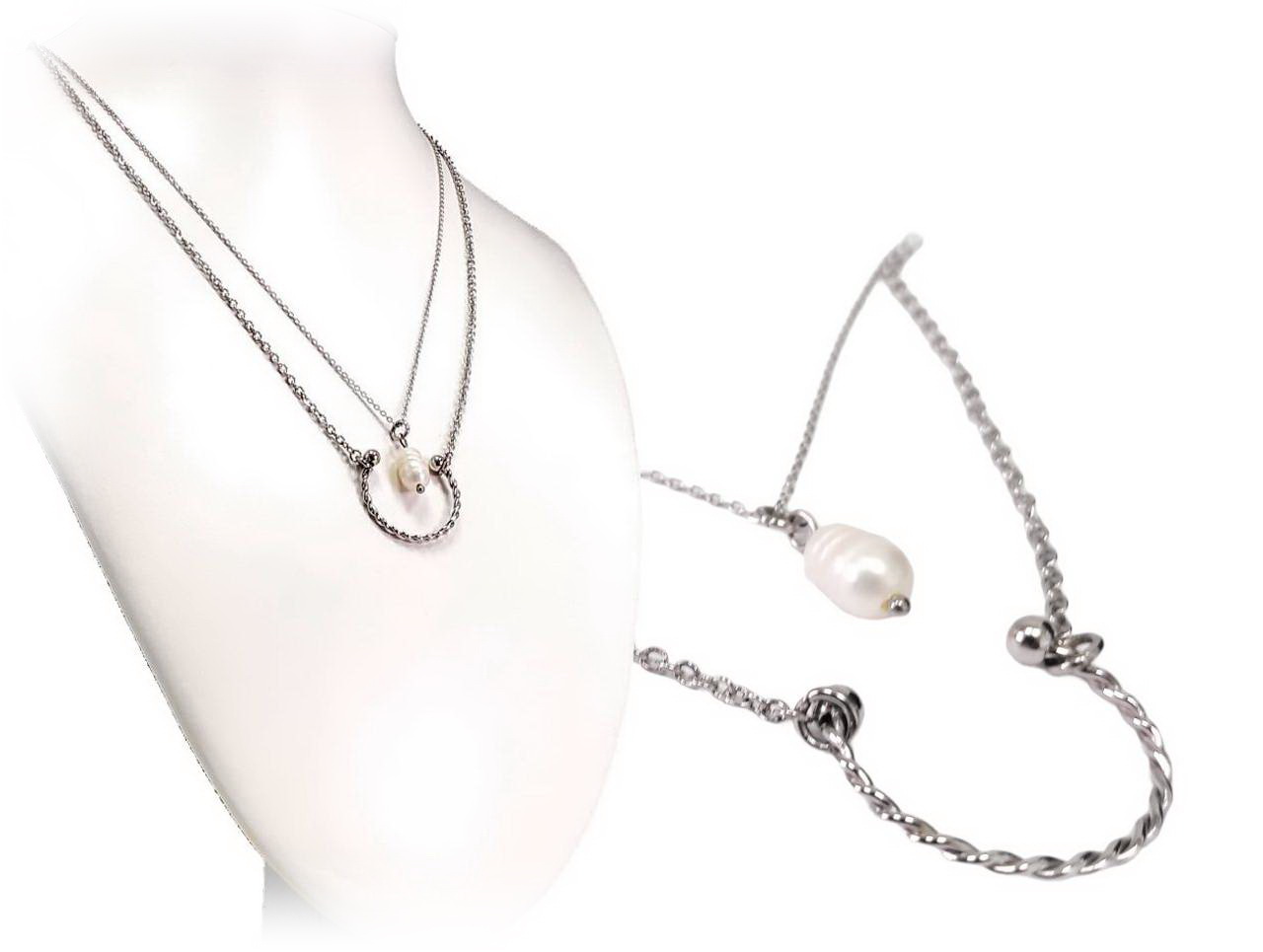 Κολιέ Ατσάλι 316L, διπλή αλυσίδα και μαργαριτάρι σε χρώμα Ασημί, Μήκος 40cm