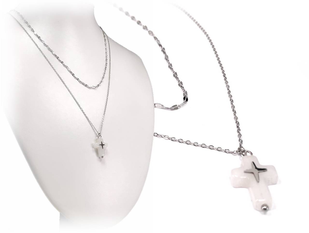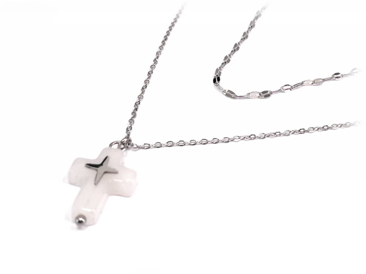 Κολιέ Ατσάλι 316L, διπλή αλυσίδα με σταυρό φίλντισι σε χρώμα Ασημί, Μήκος 40cm