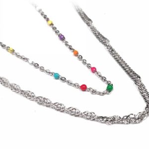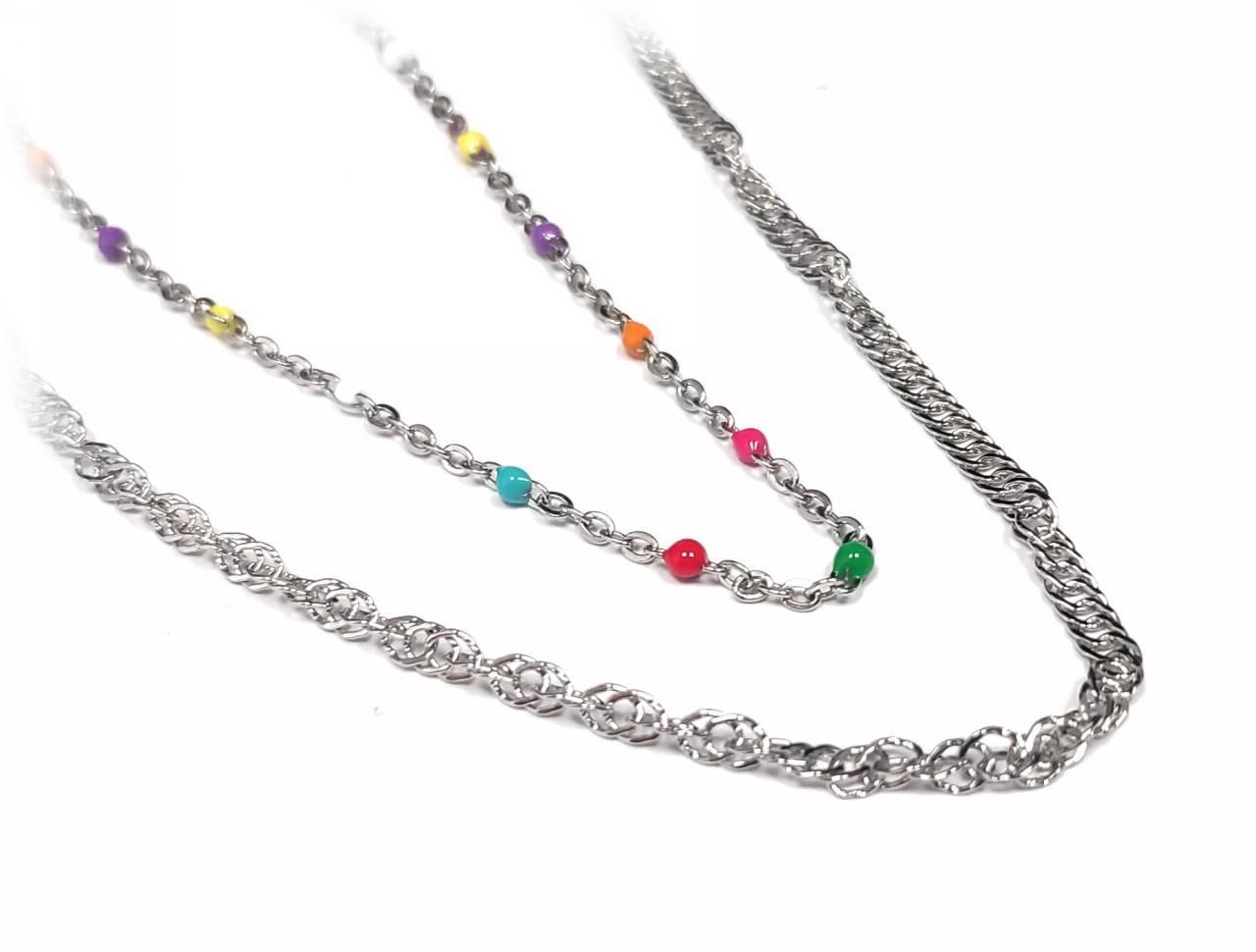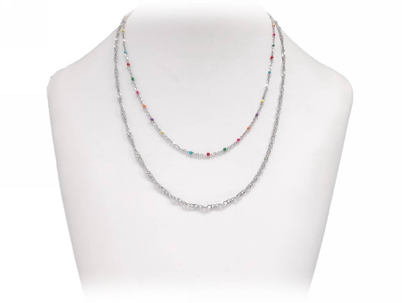 Κολιέ Πέτρα 316L, διπλή αλυσίδα με πολύχρωμες χάντρες σε χρώμα Ασημί