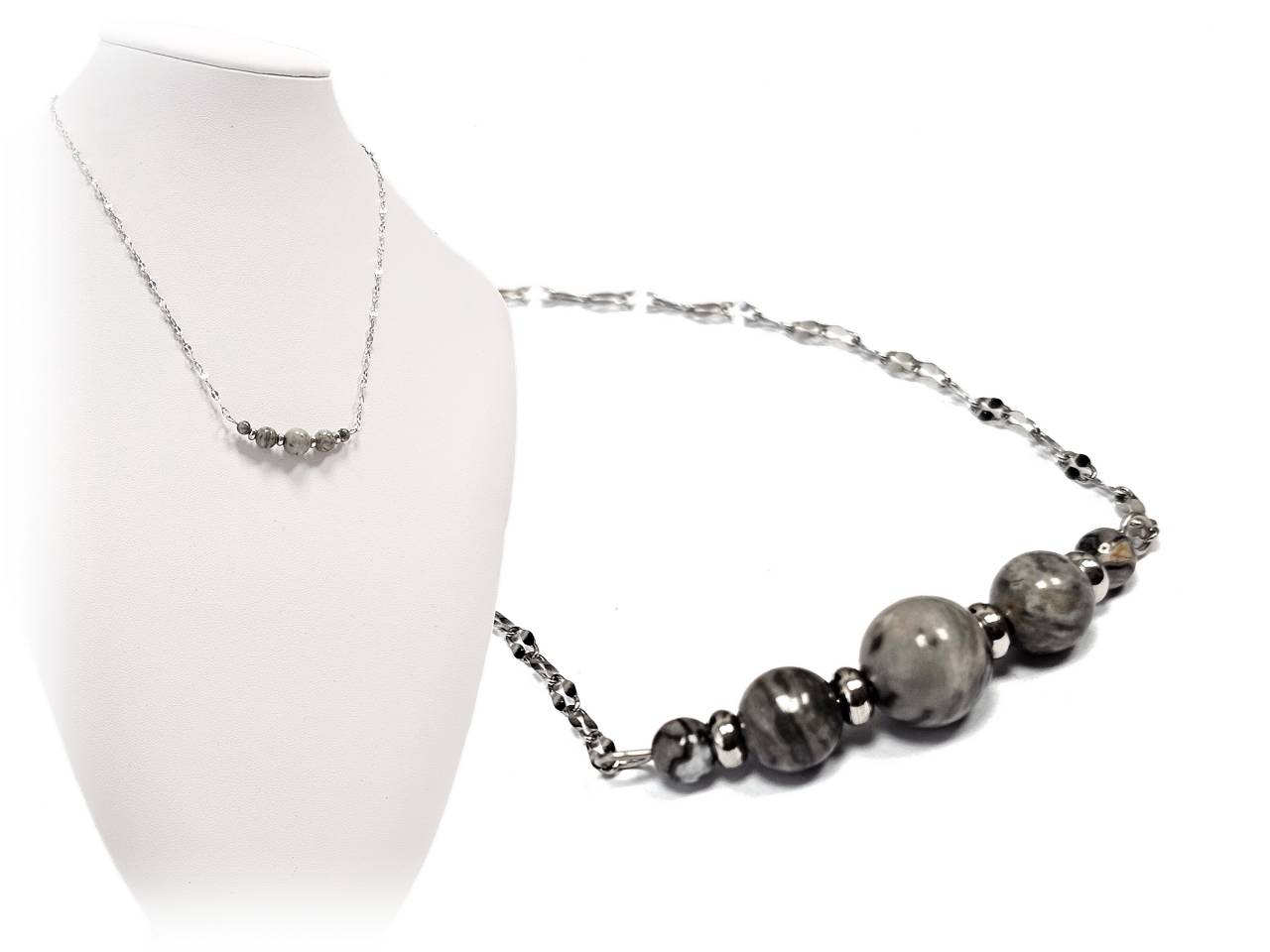 Κολιέ Πέτρα ημιπολύτιμη 4-6-8-6-4mm, ατσάλι σε χρώμα Ασημί