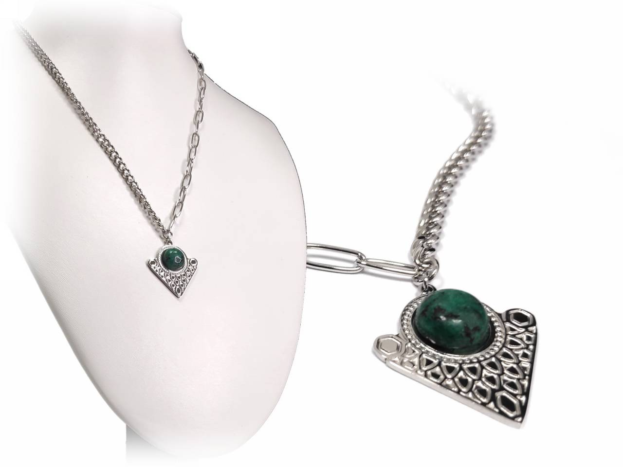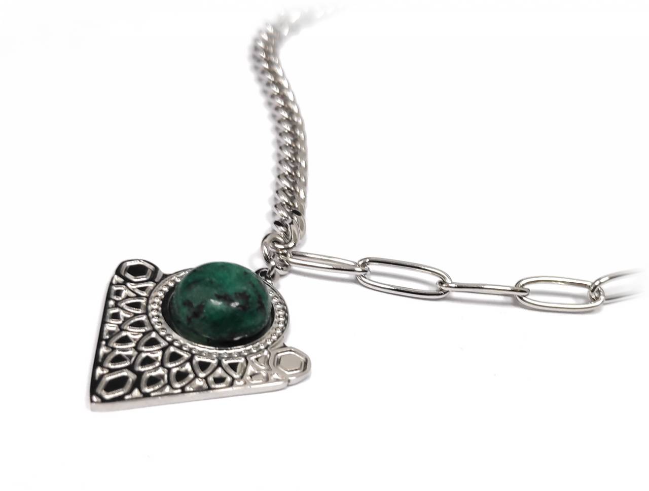 Κολιέ Πέτρα 316L, αλυσίδα με μαλαχίτη σε χρώμα Ασημί, Μήκος 40cm