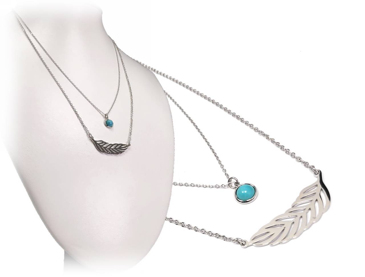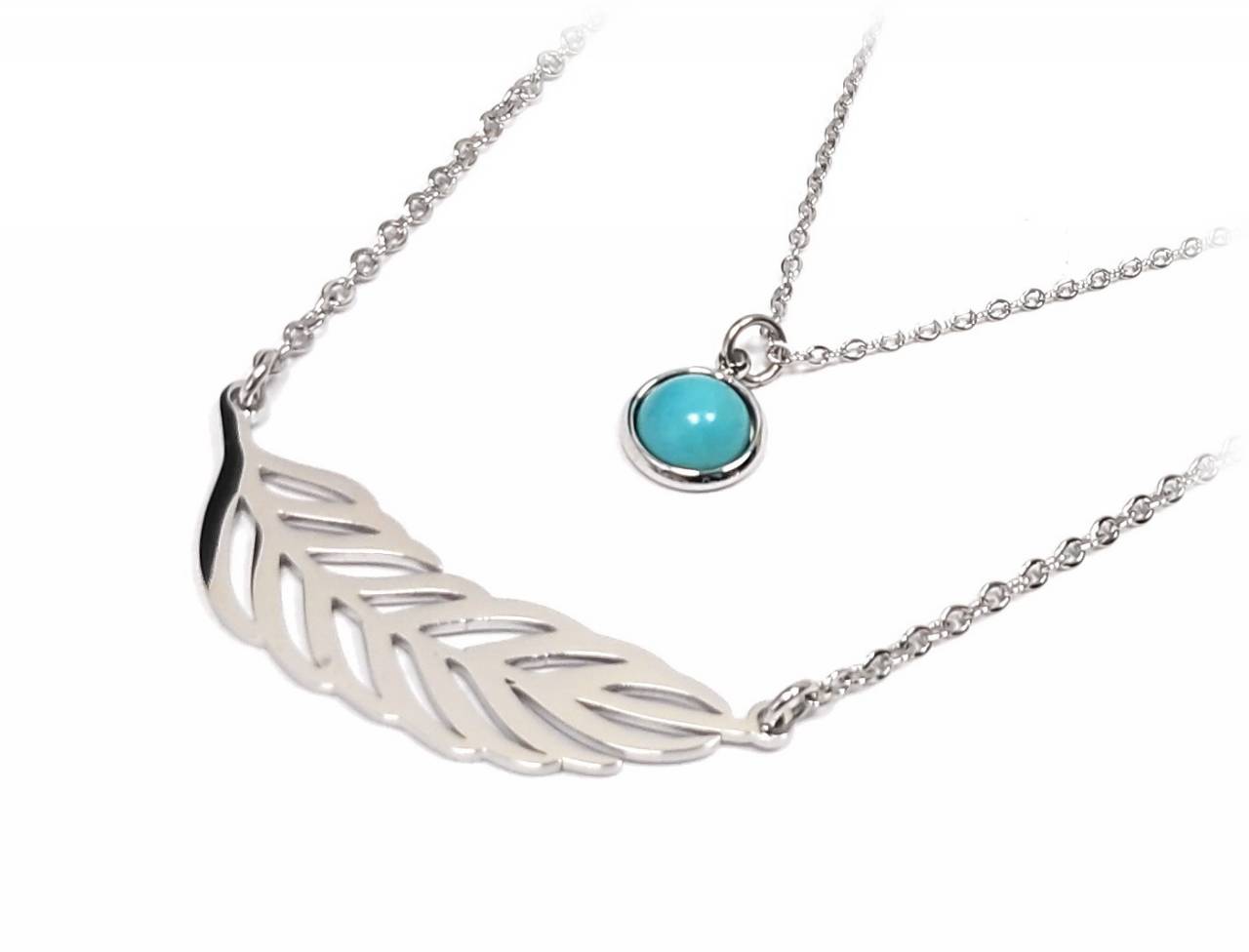 Κολιέ Πέτρα 316L, διπλή αλυσίδα με τυρκουάζ σε χρώμα Ασημί, Μήκος 40cm