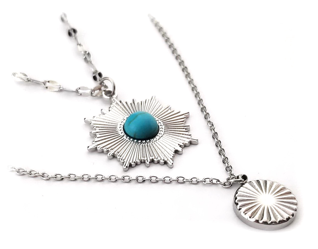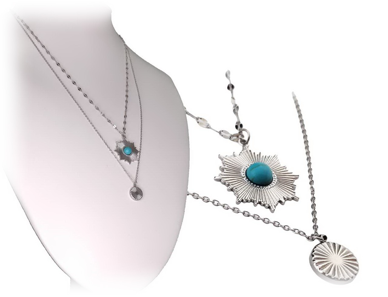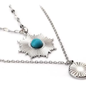 Κολιέ Πέτρα 316L, διπλή αλυσίδα με τυρκουάζ σε χρώμα Ασημί, Μήκος 45cm