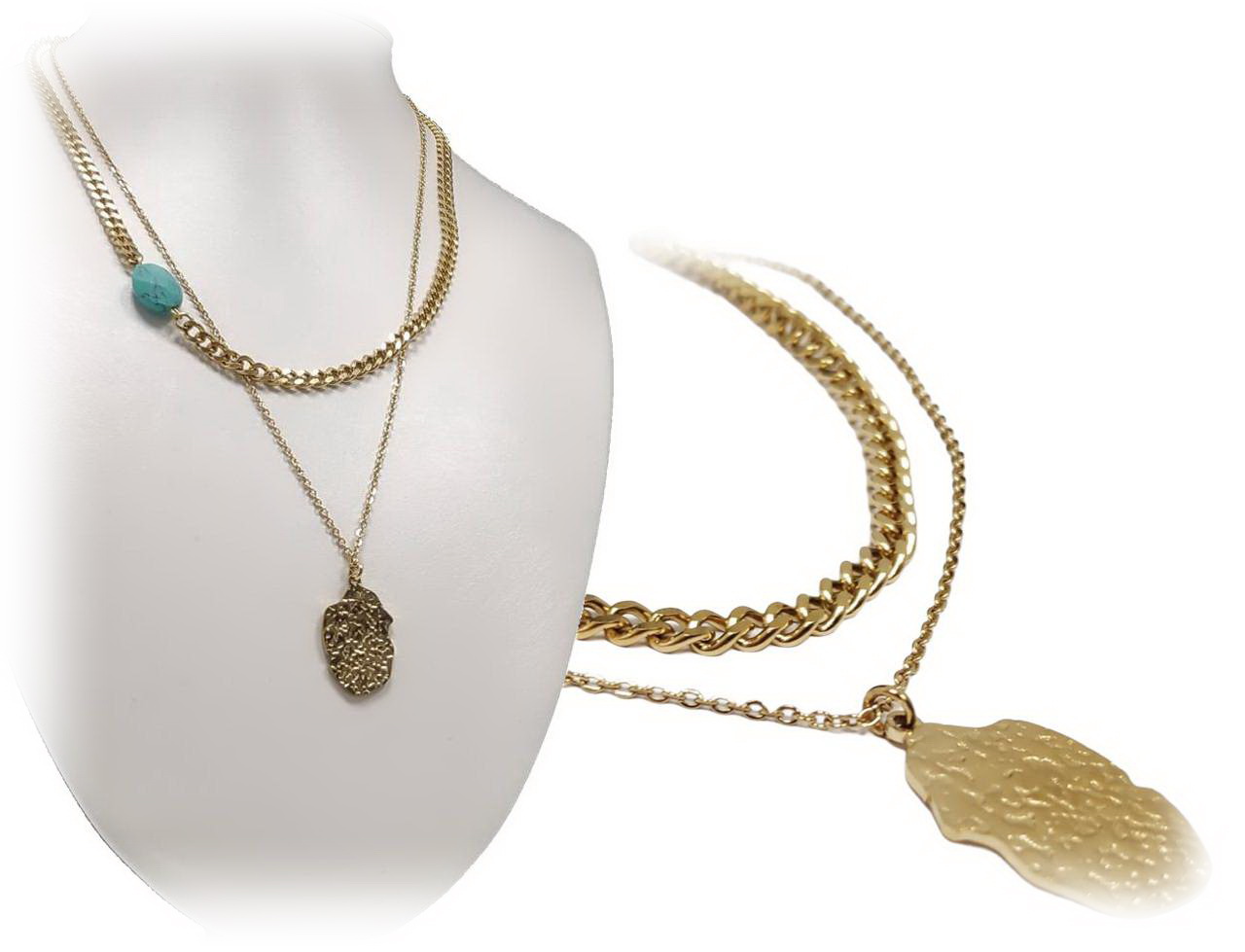 Κολιέ Πέτρα 316L, διπλή αλυσίδα με τυρκουάζ σε χρώμα Χρυσαφί, Μήκος 45cm