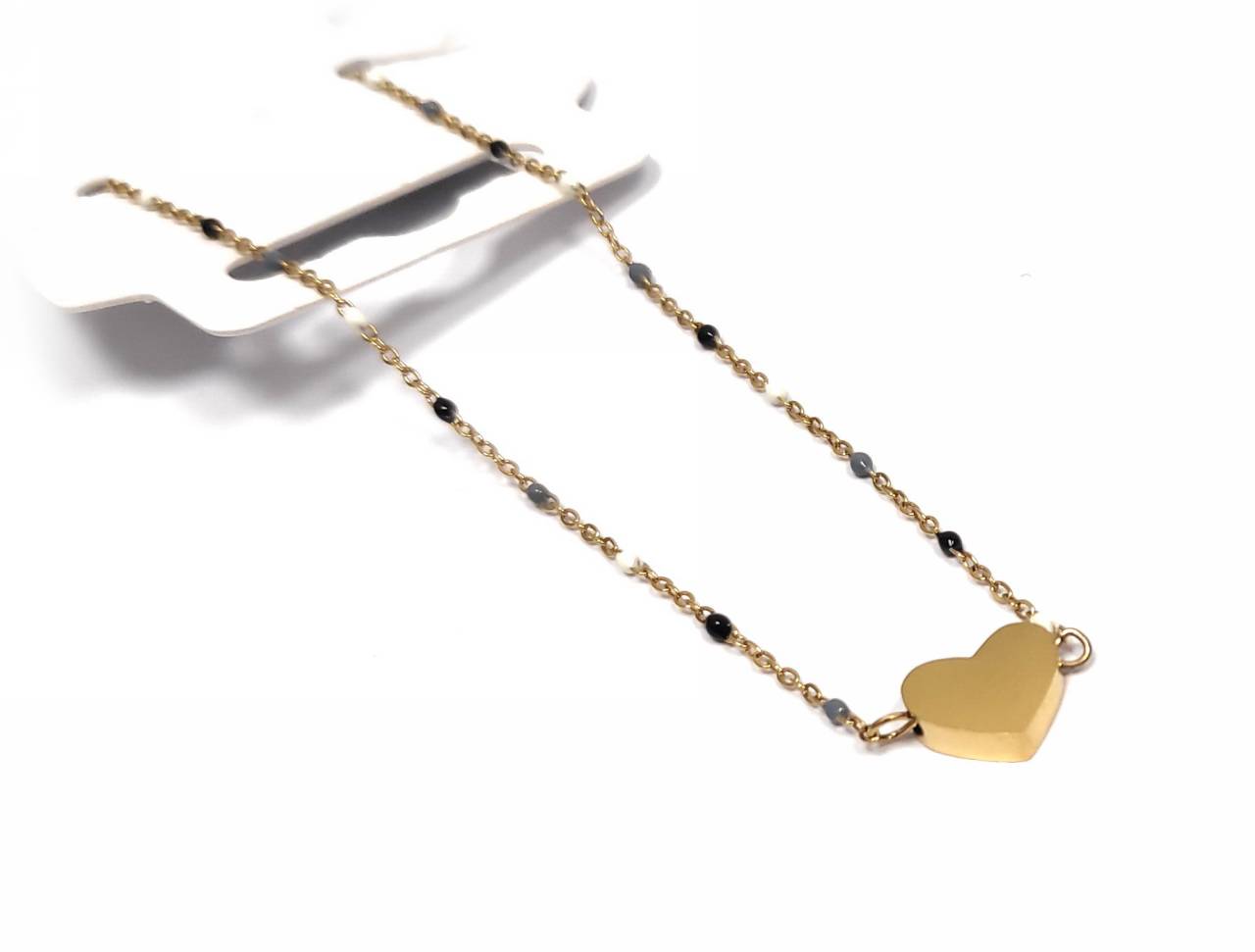 Βραχιόλι Ποδιού Ατσάλι 316L, αλυσίδα με πολύχρωμες χάντρες και καρδιά σε χρώμα Χρυσαφί