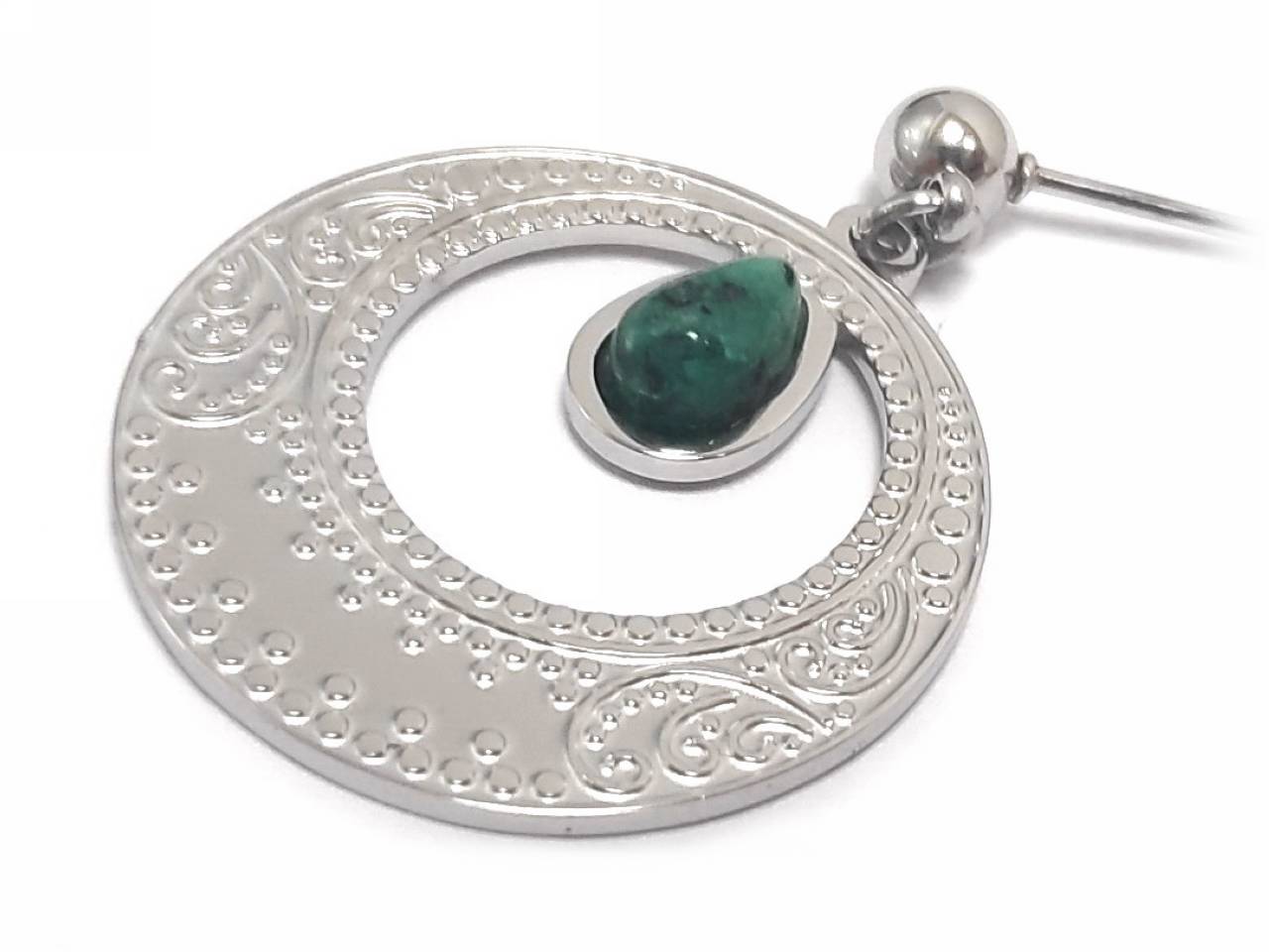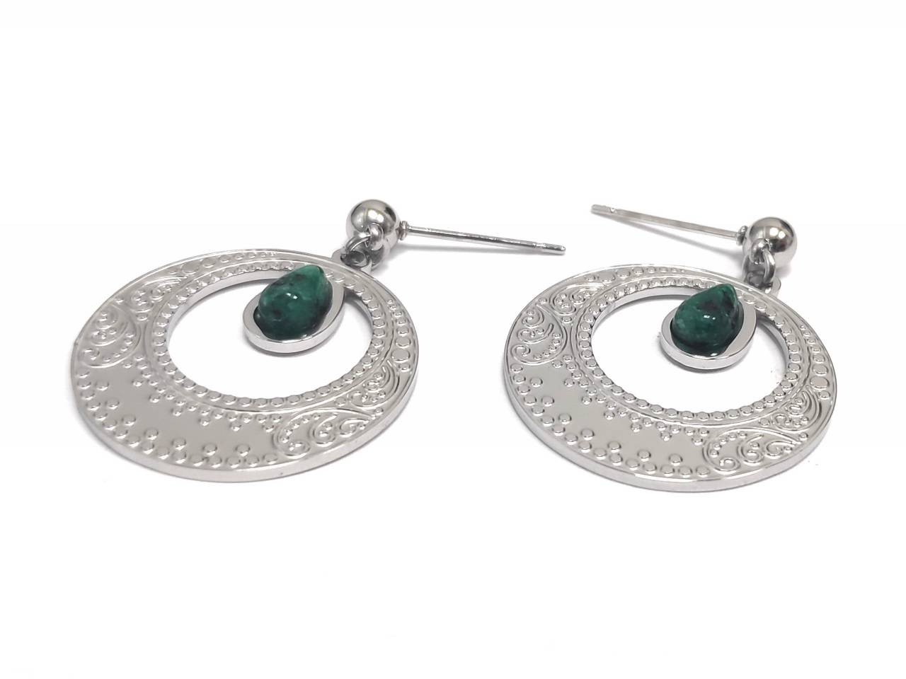 Σκουλαρίκια Πέτρα 316L, κρίκος με μαλαχίτη σε χρώμα Ασημί, Διάμετρος 2cm