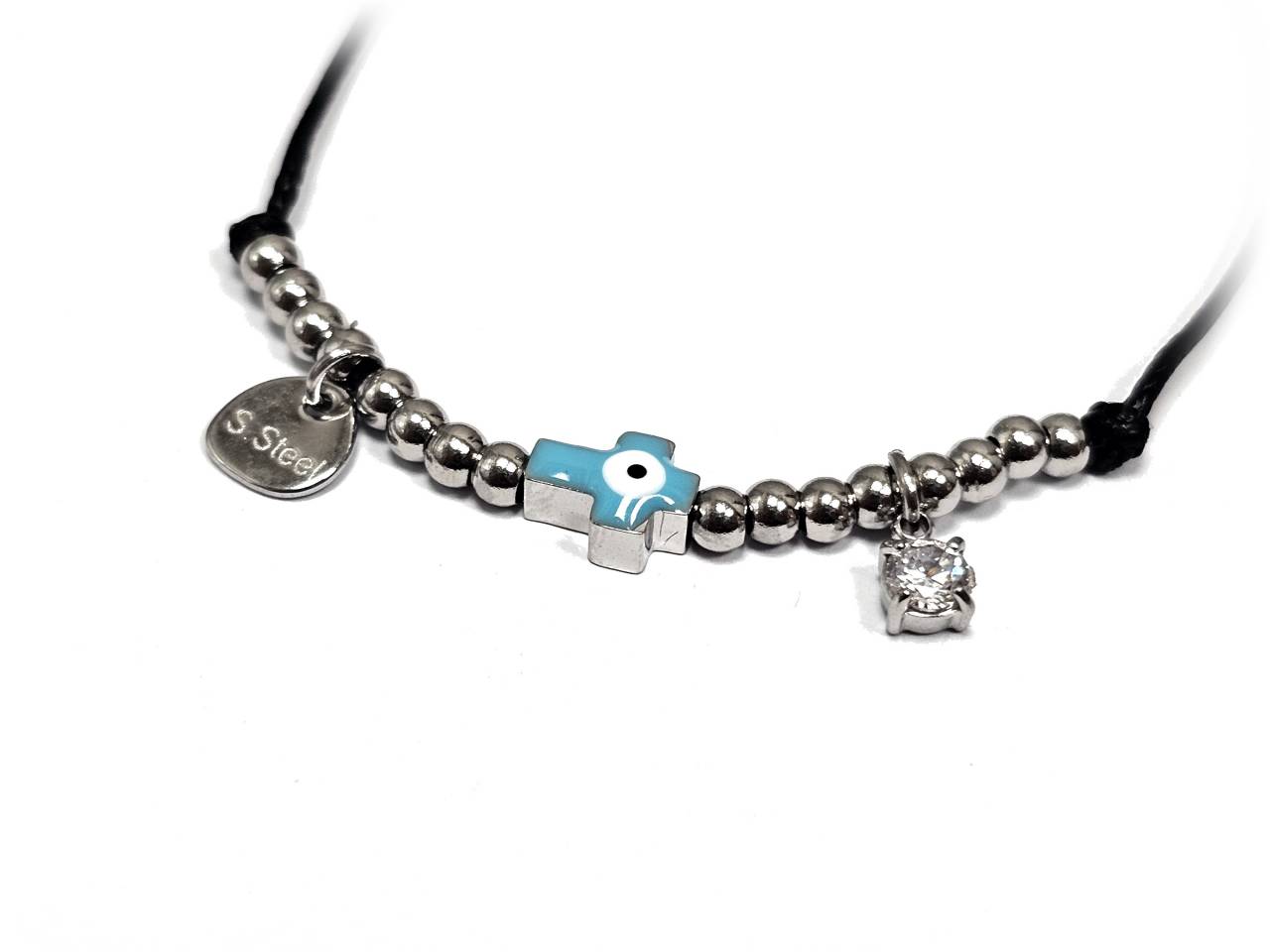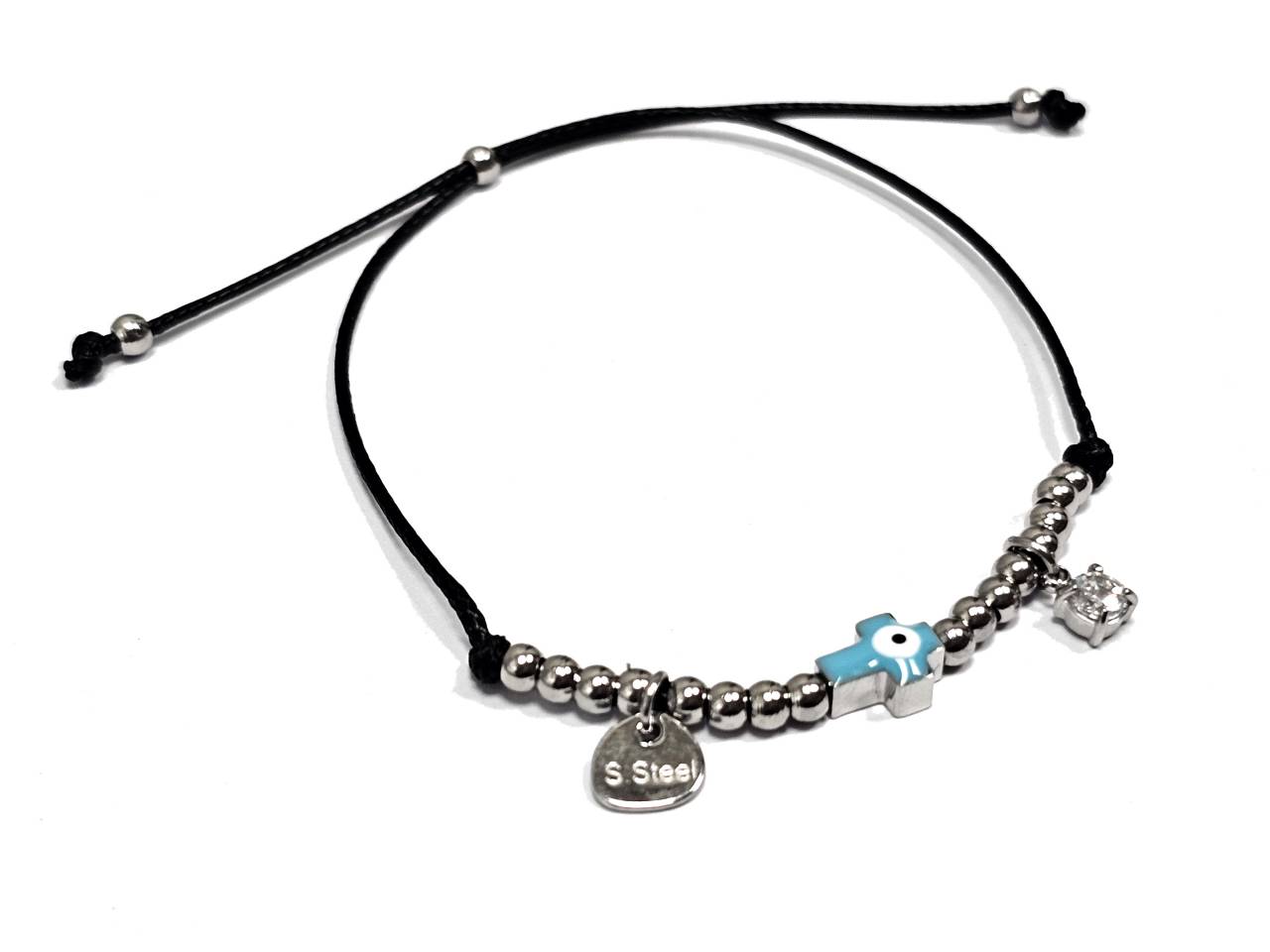 Βραχιόλι Ατσάλι 316L, κορδόνι με μάτι, στρας και σταυρό σε χρώμα Ασημί