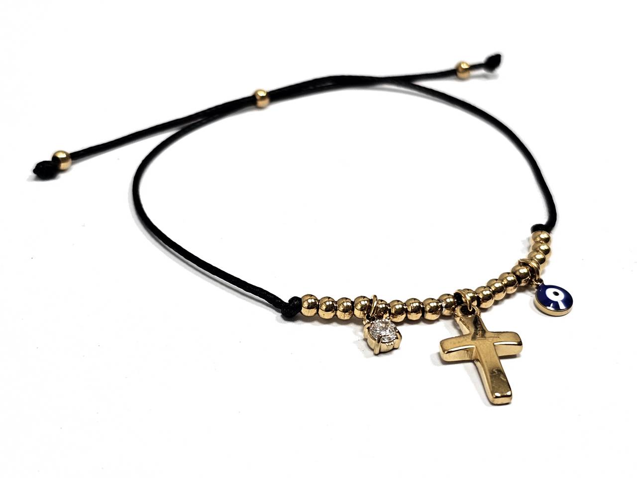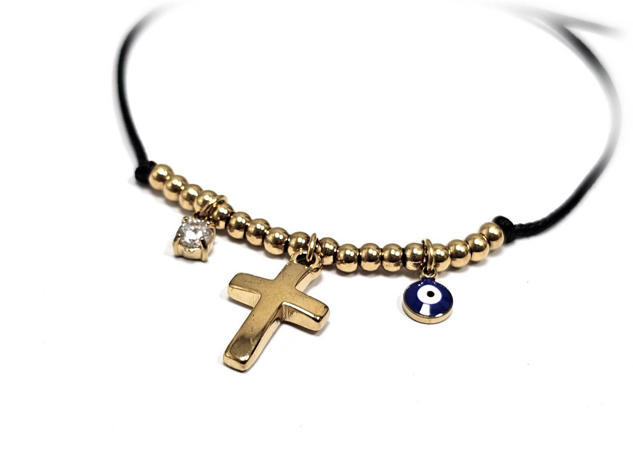 Βραχιόλι Ατσάλι 316L, κορδόνι με μάτι, στρας και σταυρό σε χρώμα Χρυσαφί