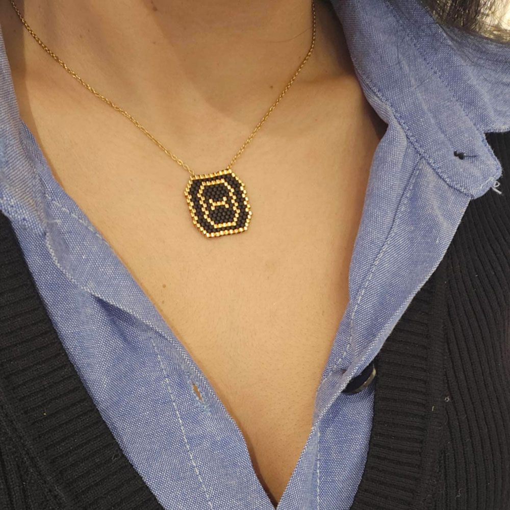 Γυναικείο Ατσάλινο Κολιέ Με Χρυσή Αλυσίδα Και Κρεμαστό Μονόγραμμα Με Μαύρες Και Χρυσές Χάντρες.Η Αλυσίδα Διαθέτει Αυξομείωση Και Προσαρμόζεται Στο Ύψος Που Επιθυμείτε.Είναι Υποαλλεργικά,Και Δεν Μαυρίζουν Μήκος Αλυσίδας: 40.0 εκ Προέκταση Αλυσίδας 5.2 εκ Υψος Κρεμαστού 1.7 εκ