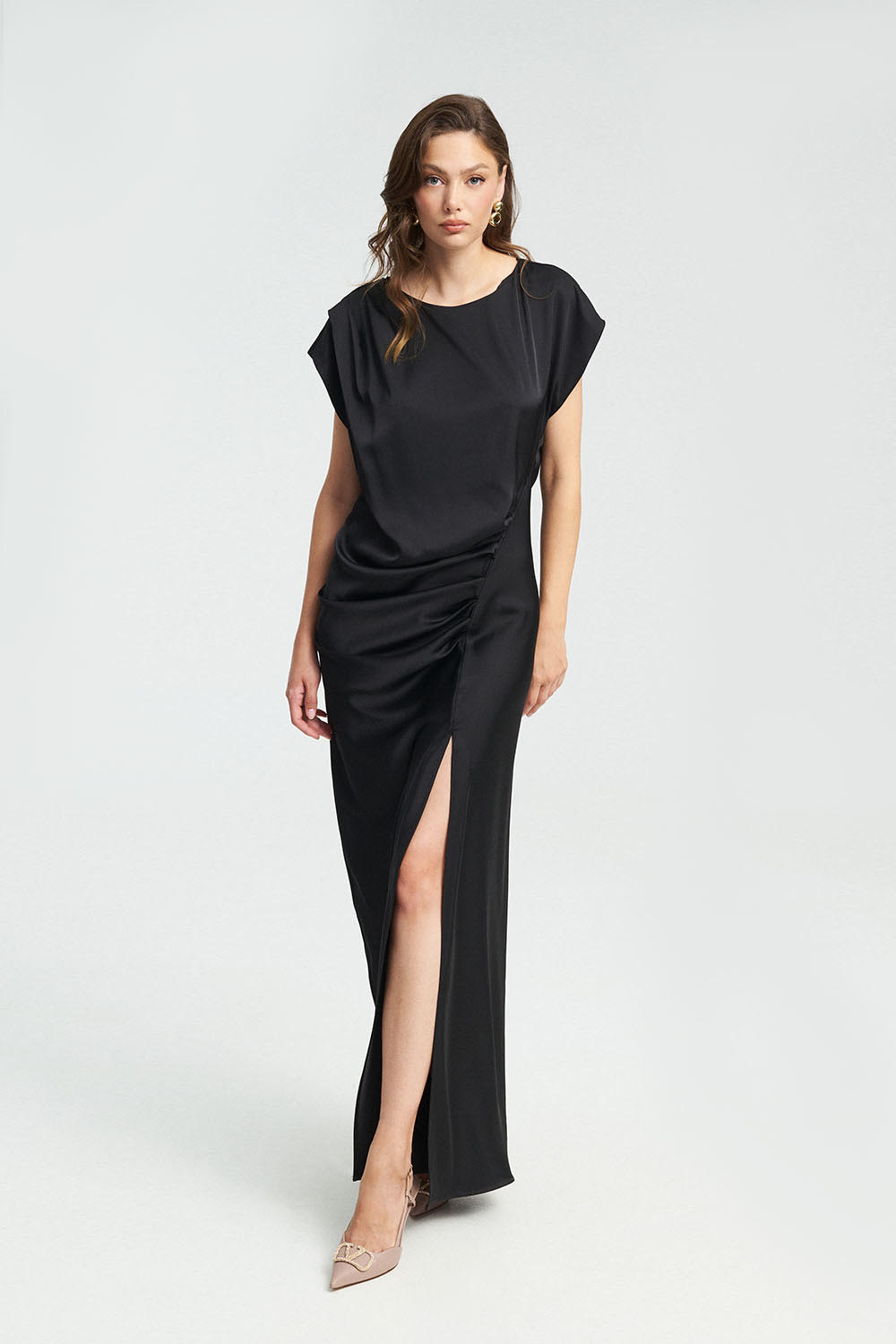 μακρύ μαύρο φόρεμα σατεν ύφασμα με σκίσιμο στο πλάι