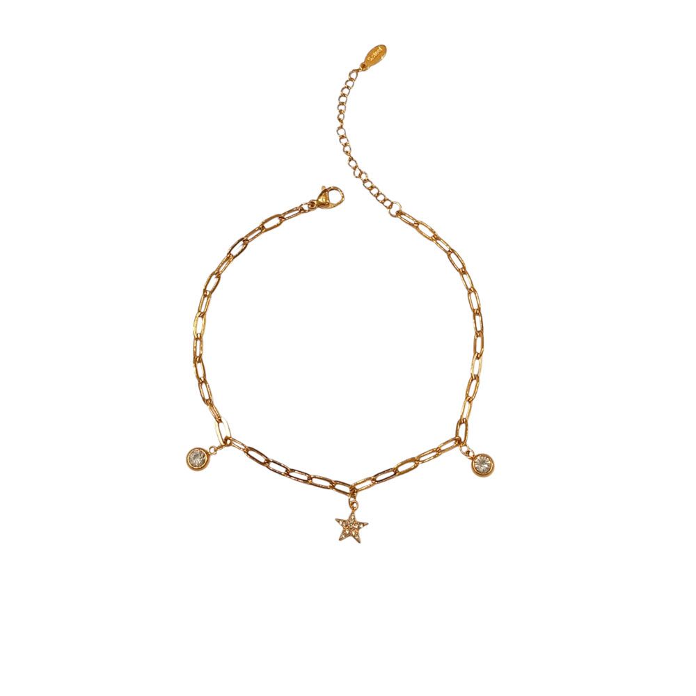 μοντέρνο βραχιόλι ποδιού με χοντρή αλυσίδα και τρία εντυπωσιακά μοτίφ – ένα αστέρι διακοσμημένο με στρας στο κέντρο και δύο λαμπερά ζιρκόν. διατίθεται σε χρυσό και ασημί χρώμα και διαθέτει επέκταση για ρύθμιση μήκους και ασφαλές κούμπωμα. ιδανικό για να δώσει λάμψη και στυλ σε κάθε καλοκαιρινή εμφάνιση, από casual μέχρι βραδινή.