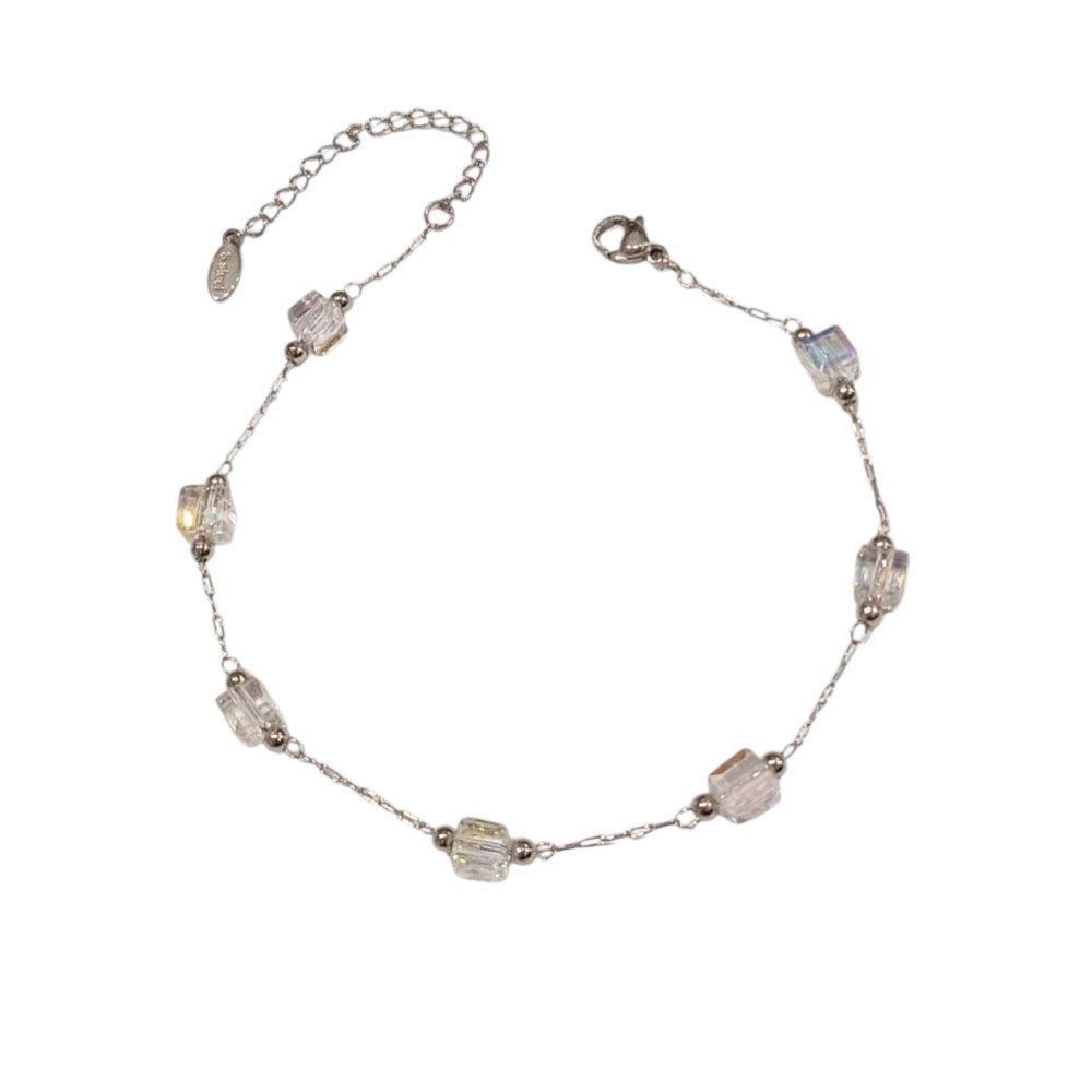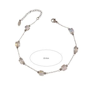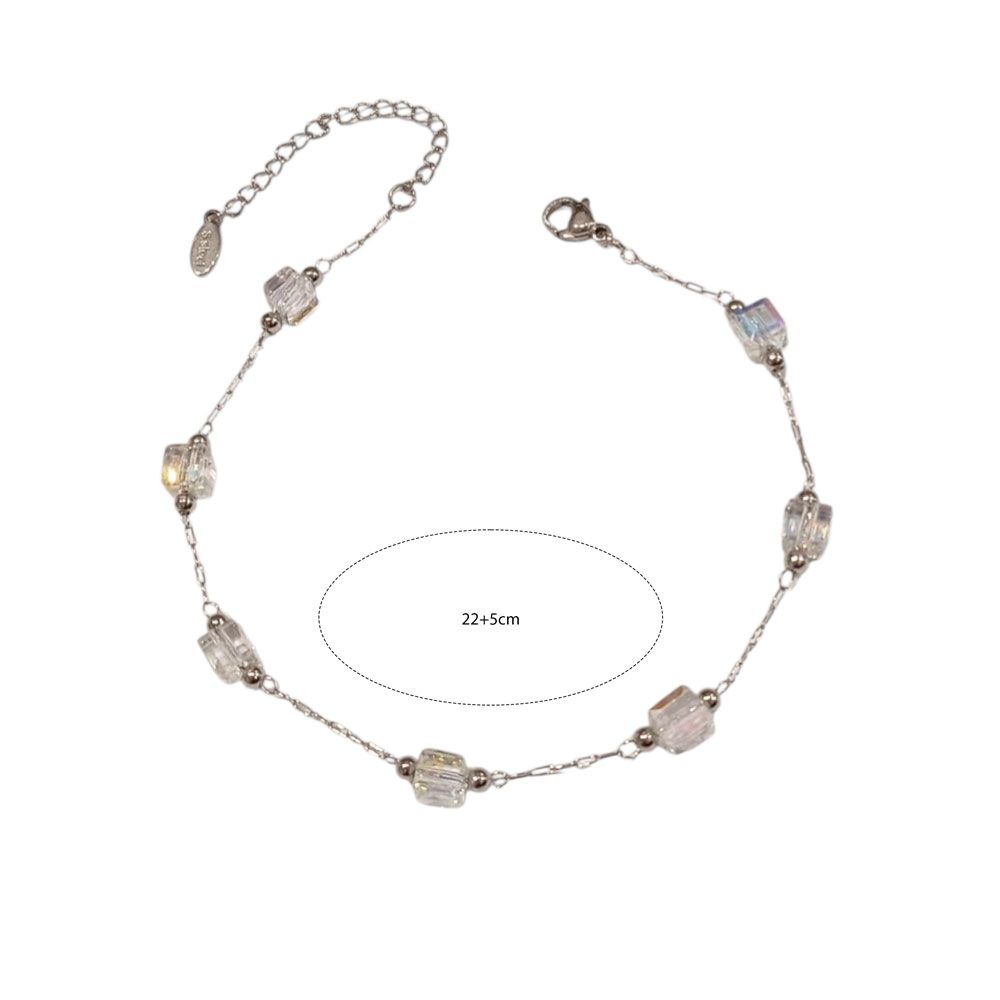 κομψό βραχιόλι ποδιού με λεπτή αλυσίδα και λευκά τετράγωνα κρυσταλλάκια που αντανακλούν το φως με διακριτική λάμψη. διαθέσιμο σε χρυσή και ασημί εκδοχή με ρυθμιζόμενο μήκος για άνετη εφαρμογή. ιδανικό για καλοκαιρινές βόλτες και ξεχωριστές εμφανίσεις.