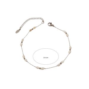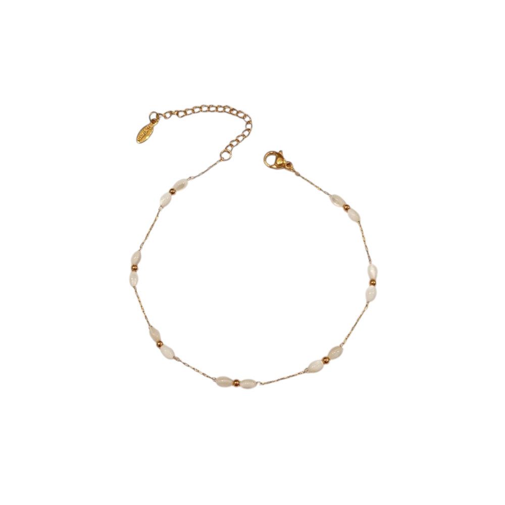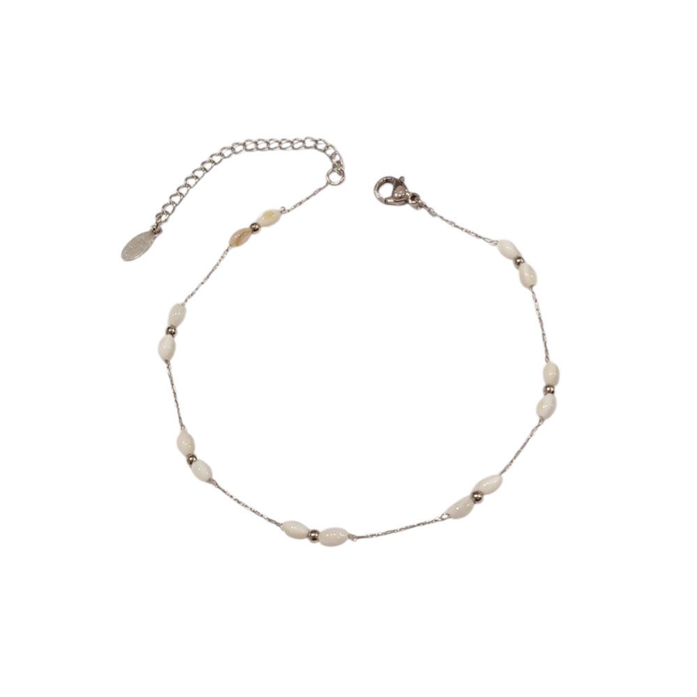 minimal βραχιόλι ποδιού με λεπτή αλυσίδα και διακοσμητικές λευκές χάντρες σε οβάλ σχήμα, συνδυασμένες με μεταλλικές λεπτομέρειες. διατίθεται σε χρυσό και ασημί χρώμα και διαθέτει ρυθμιζόμενο κούμπωμα για άνετη εφαρμογή. διακριτικό και κομψό, φοριέται εύκολα μόνο του ή σε layering και ολοκληρώνει κάθε καλοκαιρινό outfit.