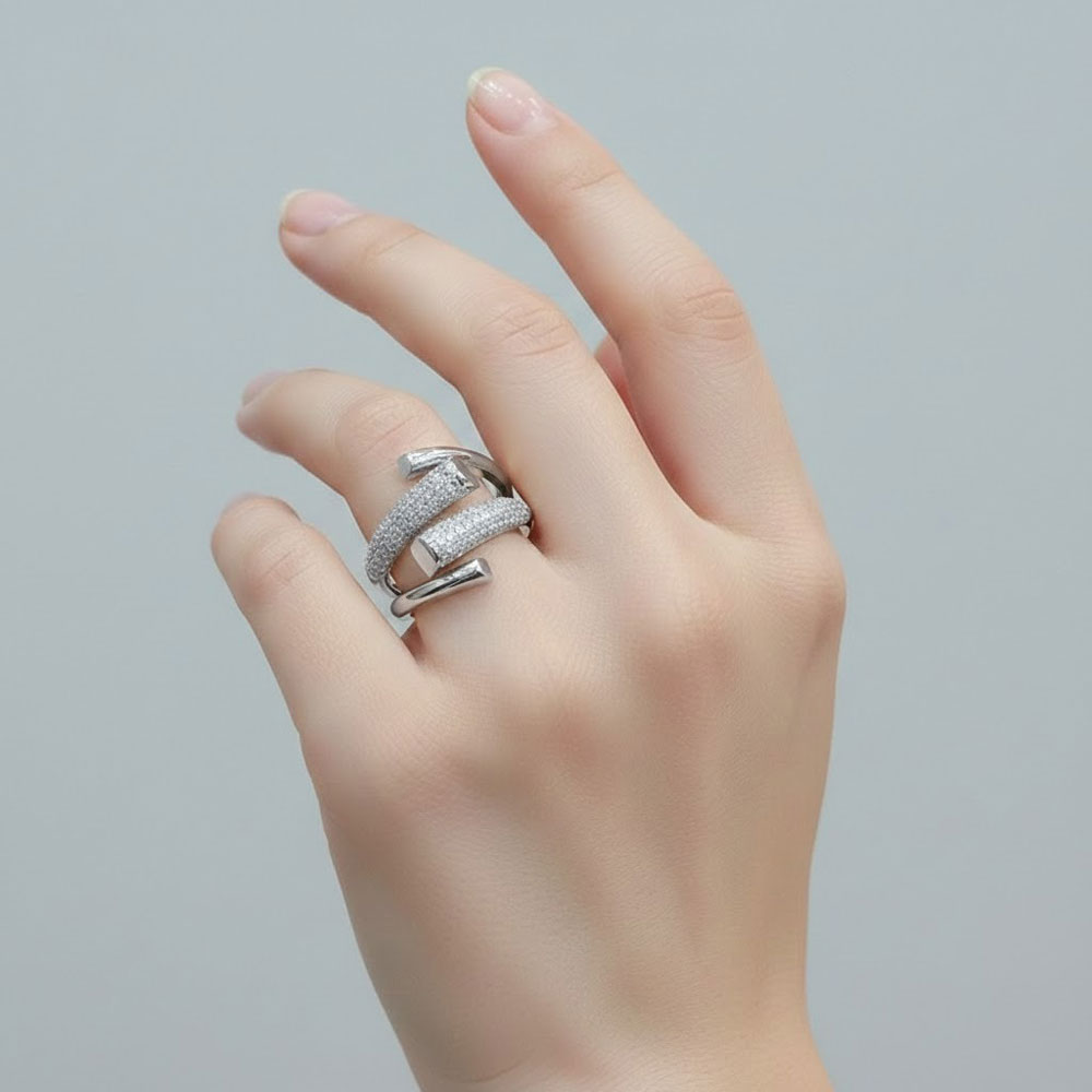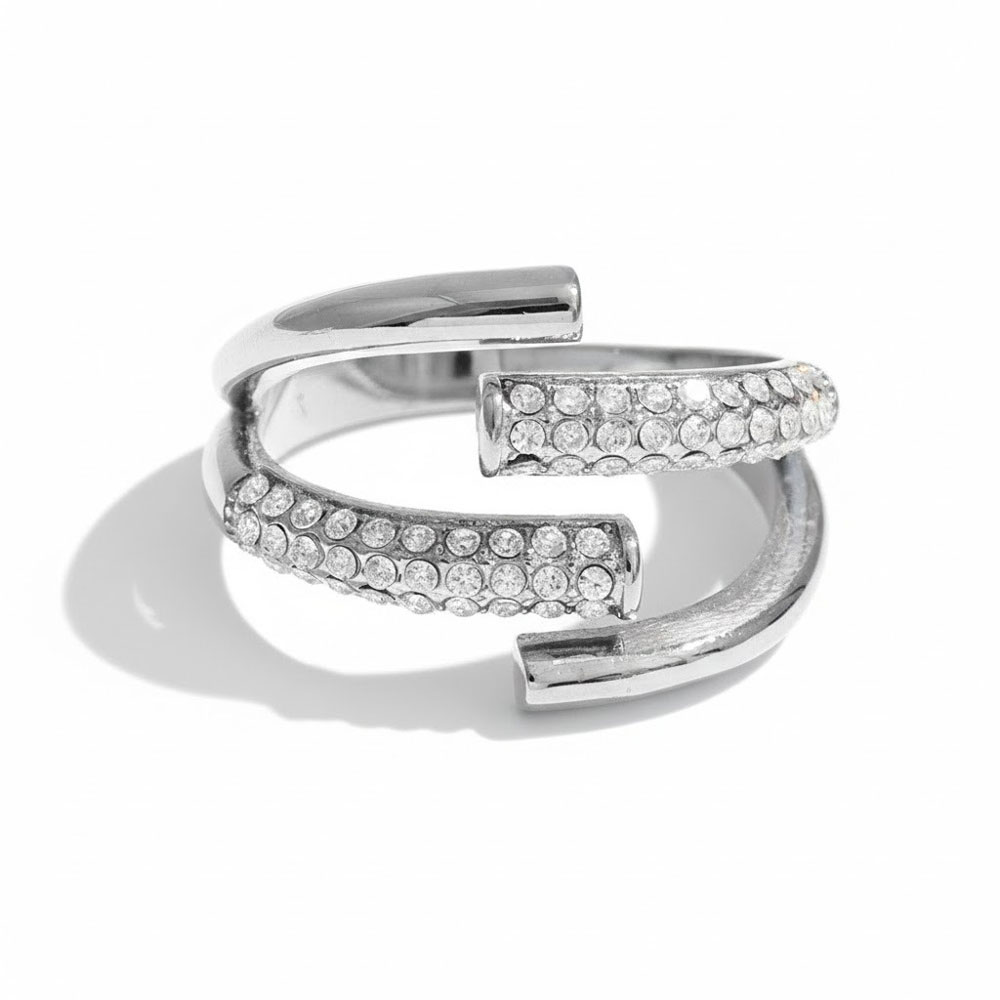 Εντυπωσιακό ατσάλινο δαχτυλίδι με ανοιχτό, μοντέρνο σχεδιασμό και λαμπερά στρας που αγκαλιάζουν αρμονικά το δάχτυλο. Η ανοιχτή του μορφή προσφέρει άνετη και προσαρμόσιμη εφαρμογή, ενώ ο συνδυασμός λείων και διακοσμημένων επιφανειών το καθιστά ιδανικό για statement εμφανίσεις. Φοριέται εύκολα από το πρωί έως το βράδυ, μόνο του ή σε συνδυασμό με άλλα δαχτυλίδια.