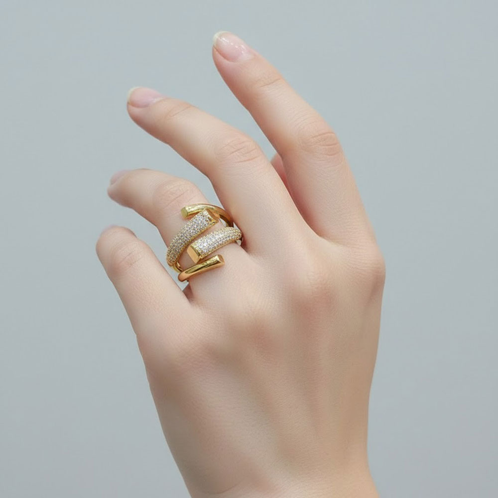 Εντυπωσιακό ατσάλινο δαχτυλίδι με ανοιχτό, μοντέρνο σχεδιασμό και λαμπερά στρας που αγκαλιάζουν αρμονικά το δάχτυλο. Η ανοιχτή του μορφή προσφέρει άνετη και προσαρμόσιμη εφαρμογή, ενώ ο συνδυασμός λείων και διακοσμημένων επιφανειών το καθιστά ιδανικό για statement εμφανίσεις. Φοριέται εύκολα από το πρωί έως το βράδυ, μόνο του ή σε συνδυασμό με άλλα δαχτυλίδια.