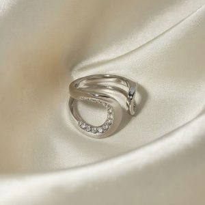Εντυπωσιακό ατσάλινο δαχτυλίδι με διπλό σχέδιο φεγγαριού, διακοσμημένο με λαμπερά στρας που χαρίζουν διακριτική λάμψη. Το ανοιχτό του design αγκαλιάζει το δάχτυλο και δημιουργεί ένα σύγχρονο, κομψό αποτέλεσμα που ξεχωρίζει χωρίς υπερβολή.Ιδανικό για καθημερινές αλλά και πιο ιδιαίτερες εμφανίσεις, φοριέται μόνο του ή συνδυάζεται εύκολα με άλλα κοσμήματα.