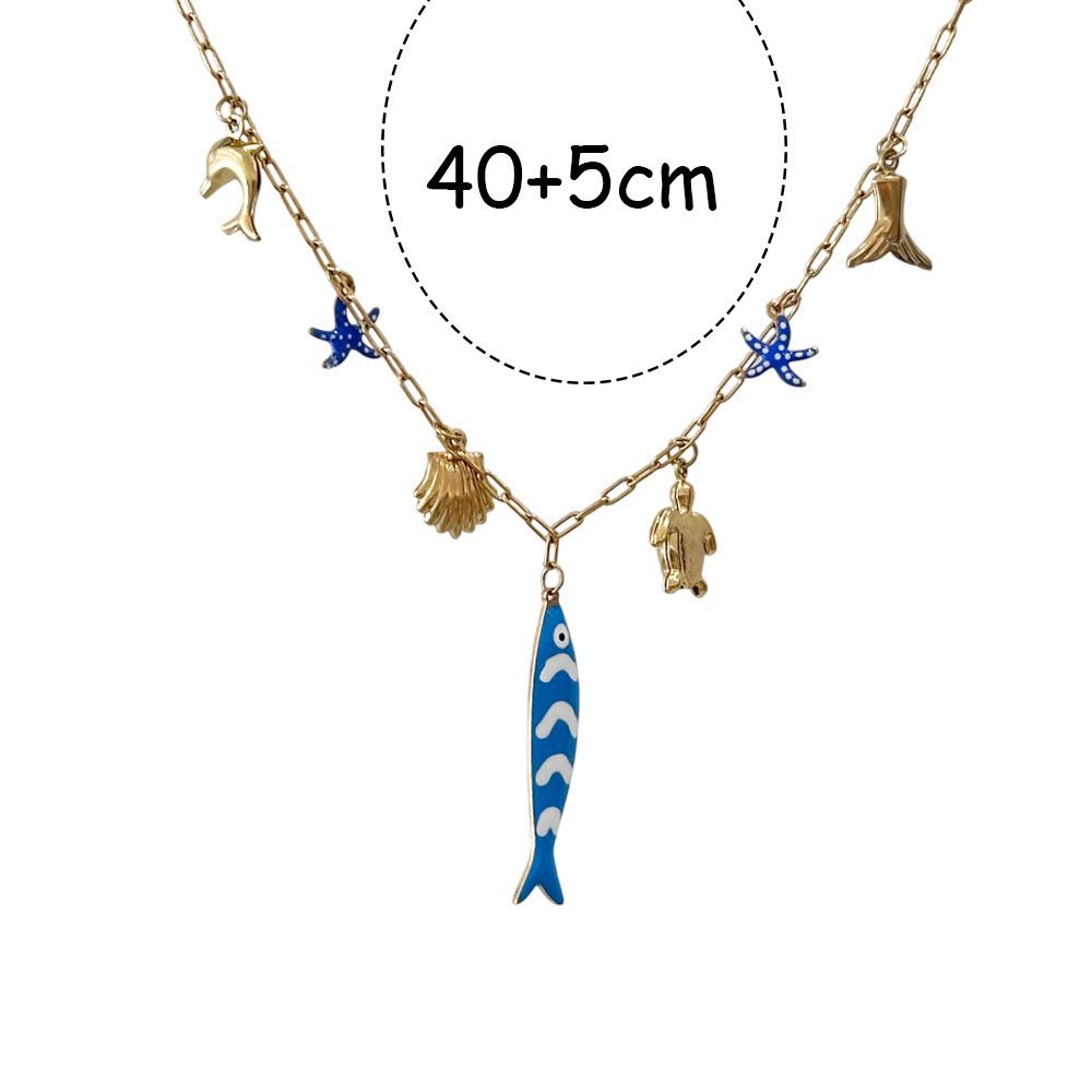 Τίτλος:Ατσάλινο Κολιέ με Μπλε Ψαράκι & Θαλασσινά Κρεμαστά – Καλοκαιρινό Σχέδιο Περιγραφή:Χαριτωμένο ατσάλινο κολιέ με χρυσή αλυσίδα και εντυπωσιακά θαλασσινά μοτίβα, όπως μπλε ψαράκι, αστερίες, δελφίνι, κοχύλι, χελωνάκι και ουρά φάλαινας. Το μπλε σμάλτο στο ψάρι προσθέτει ζωντάνια και καλοκαιρινή διάθεση στο κόσμημα, ενώ η λεπτομέρεια της κάθε φιγούρας δημιουργεί μια παιχνιδιάρικη αλλά κομψή εμφάνιση.Υλικό: Ανοξείδωτο ατσάλι (stainless steel) Μήκος: 40+5cm προέκτασηΧαρακτηριστικά: Δεν μαυρίζει – Ανθεκτικό στο νερό – ΥποαλλεργικόΙδανικό για: Καλοκαιρινά looks, παραλία, διακοπές ή μοναδικό δώρο