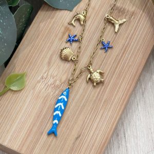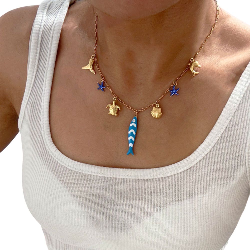 Ατσάλινο Κολιέ με Μπλε Ψαράκι & Θαλασσινά Κρεμαστά