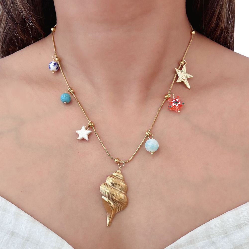 Φέρτε τη θαλασσινή αύρα στο στυλ σας με αυτό το ατσάλινο κολιέ, διακοσμημένο με εντυπωσιακό χρυσό κοχύλι, αστερία και πολύχρωμα charms. Ο συνδυασμός μεταλλικών και παιχνιδιάρικων στοιχείων δημιουργεί μια boho chic αισθητική που απογειώνει κάθε καλοκαιρινό outfit. Ιδανικό για εμφανίσεις στην πόλη και στις διακοπές, χαρίζοντας στυλ, λάμψη και ανεμελιά.Μήκος: 40 + 6 cm (ρυθμιζόμενο).