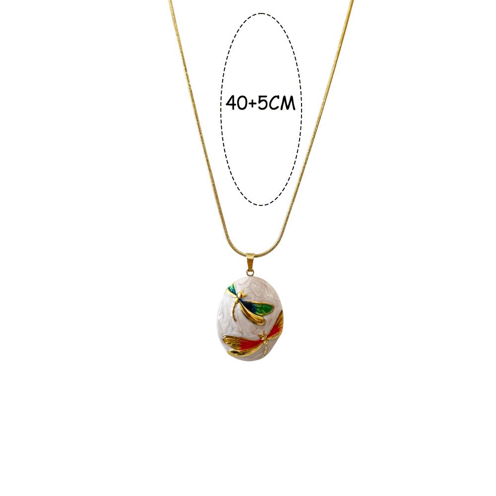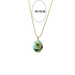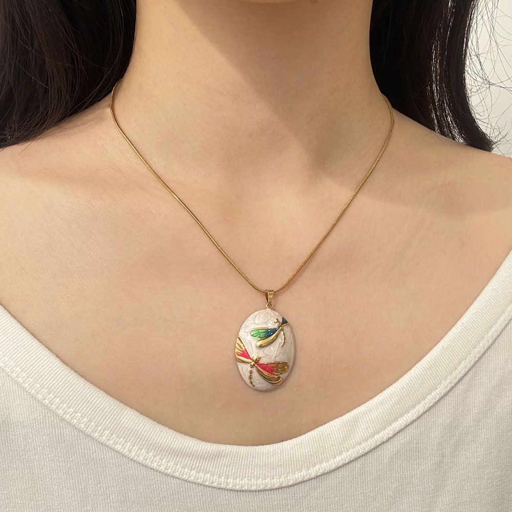 Εντυπωσιακό ατσάλινο κολιέ με οβάλ ανάγλυφο μενταγιόν, διακοσμημένο με δύο λιβελούλες σε χρυσές και πολύχρωμες αποχρώσεις. Ο λευκός φόντος και οι λεπτομέρειες σε πράσινο, κόκκινο και χρυσό δημιουργούν ένα φυσικό, κομψό αποτέλεσμα. Κατασκευασμένο από ανοξείδωτο ατσάλι, προσφέρει αντοχή στη φθορά και ιδανική εφαρμογή με ρυθμιζόμενο μήκος 40+5cm. Ιδανικό για να προσθέσει μια καλλιτεχνική πινελιά σε κάθε εμφάνιση.