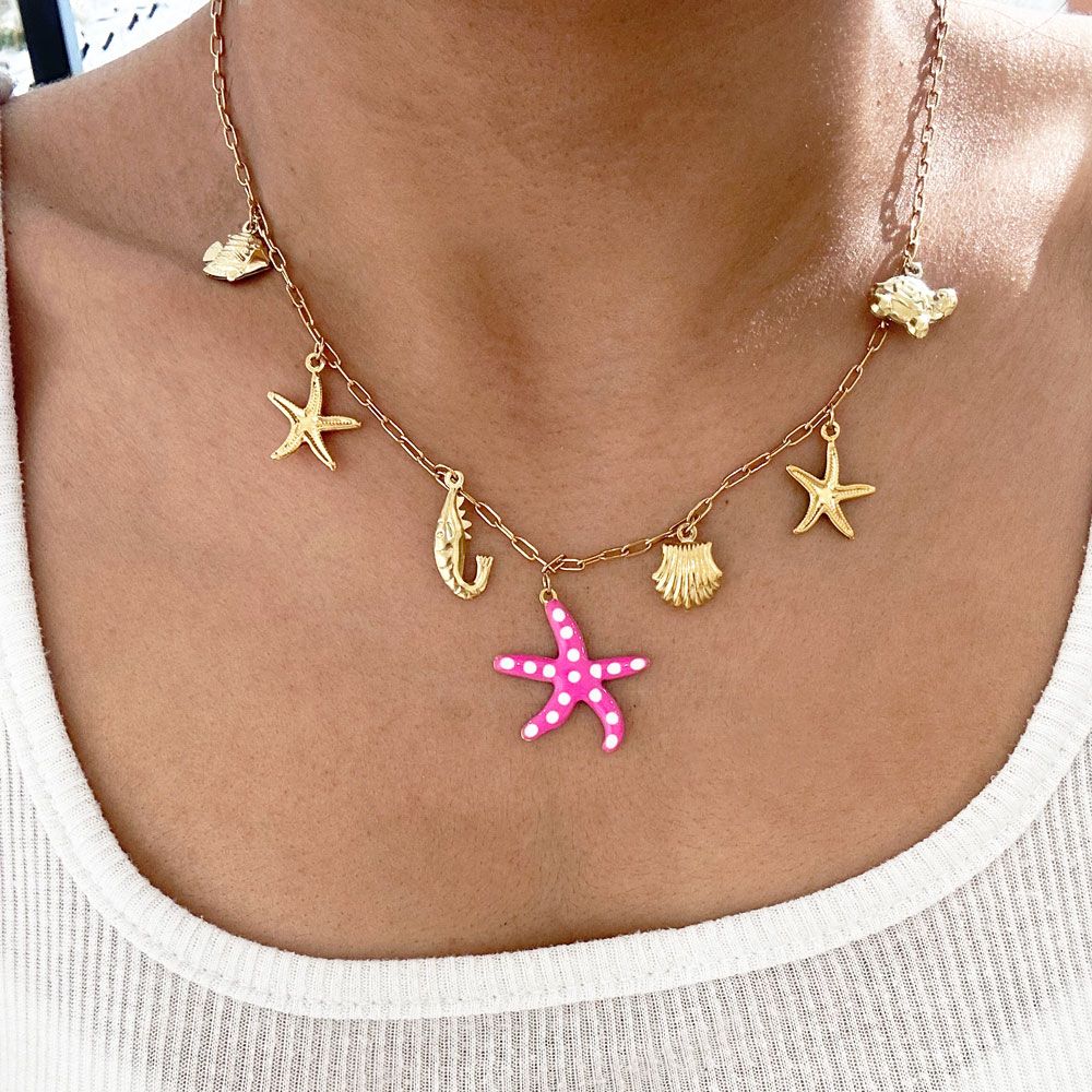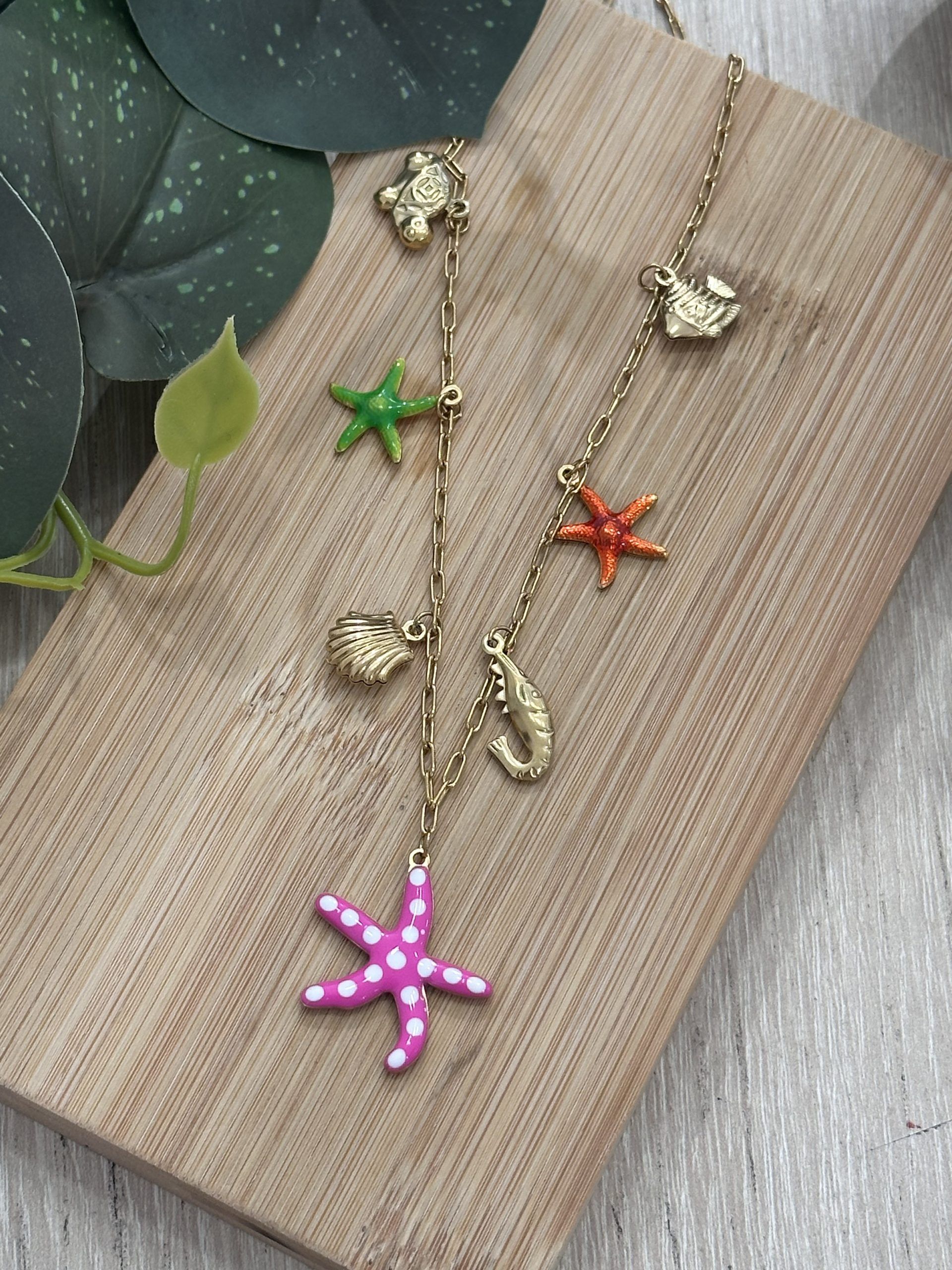 Ένα παιχνιδιάρικο και καλοκαιρινό κολιέ από ανοξείδωτο ατσάλι, ιδανικό για να φωτίσει κάθε σου εμφάνιση! Με ροζ αστερία στο κέντρο και πολύχρωμα θαλασσινά μοτίβα όπως κοχύλι, χελώνα, γάντζος και αστερίας, αποπνέει αέρα ανεμελιάς και διακοπών. Ανθεκτικό και ελαφρύ, μπορεί να φορεθεί καθημερινά και να συνδυαστεί εύκολα με άλλα κοσμήματα. Χαρακτηριστικά: Υλικό: Ανοξείδωτο ατσάλι Μήκος αλυσίδας: 40 + 5 cm (ρυθμιζόμενο) Κρεμαστά: Πολύχρωμα σμάλτα & μεταλλικά στοιχεία Δεν μαυρίζει – Ανθεκτικό στο νερό Ιδανικό για καλοκαιρινό, boho ή casual στυλ