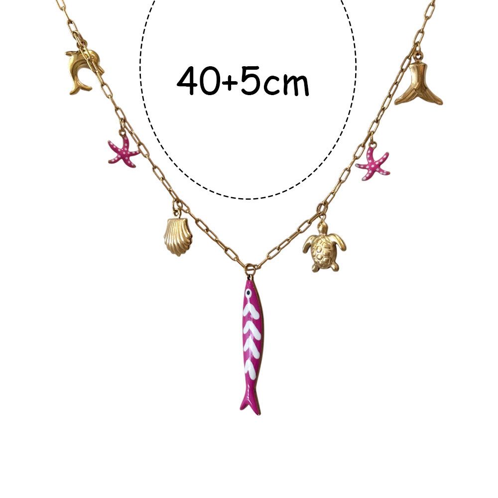 Τίτλος:Ατσάλινο Κολιέ με Μπλε Ψαράκι & Θαλασσινά Κρεμαστά – Καλοκαιρινό Σχέδιο Περιγραφή:Χαριτωμένο ατσάλινο κολιέ με χρυσή αλυσίδα και εντυπωσιακά θαλασσινά μοτίβα, όπως ροζ ψαράκι, αστερίες, δελφίνι, κοχύλι, χελωνάκι και ουρά φάλαινας. Το μπλε σμάλτο στο ψάρι προσθέτει ζωντάνια και καλοκαιρινή διάθεση στο κόσμημα, ενώ η λεπτομέρεια της κάθε φιγούρας δημιουργεί μια παιχνιδιάρικη αλλά κομψή εμφάνιση.Υλικό: Ανοξείδωτο ατσάλι (stainless steel) Μήκος: 40cm + 5cm προέκτασηΧαρακτηριστικά: Δεν μαυρίζει – Ανθεκτικό στο νερό – ΥποαλλεργικόΙδανικό για: Καλοκαιρινά looks, παραλία, διακοπές ή μοναδικό δώρο