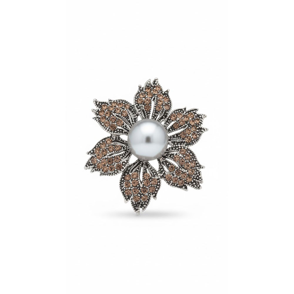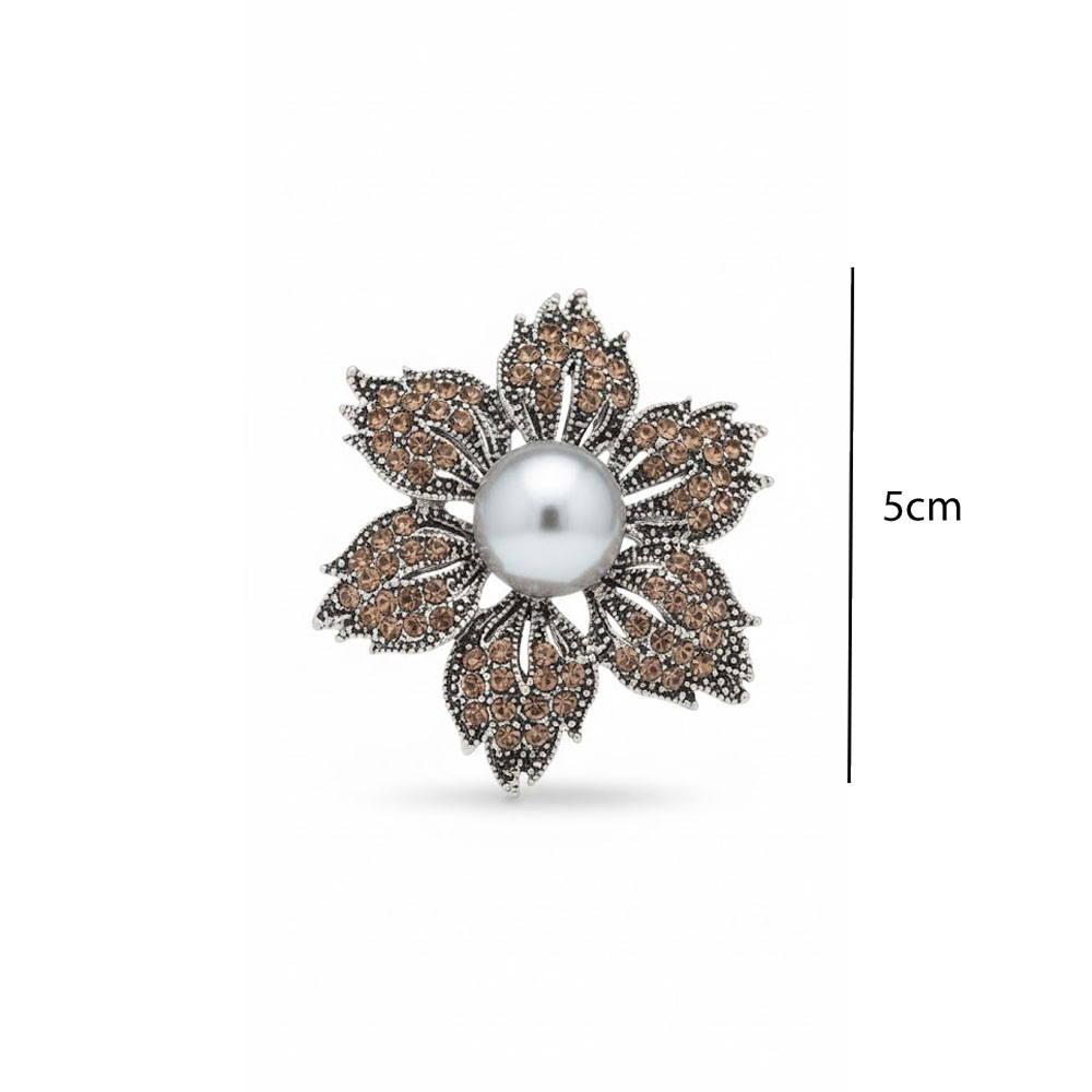 Κομψή καρφίτσα σε συμμετρικό σχέδιο λουλουδιού, με εντυπωσιακή κεντρική πέρλα και λαμπερές λεπτομέρειες από κρύσταλλα σε ζεστούς τόνους. Ιδανική για να αναβαθμίσει σακάκια, παλτό ή φορέματα, προσθέτοντας διαχρονική φινέτσα σε κάθε εμφάνιση.