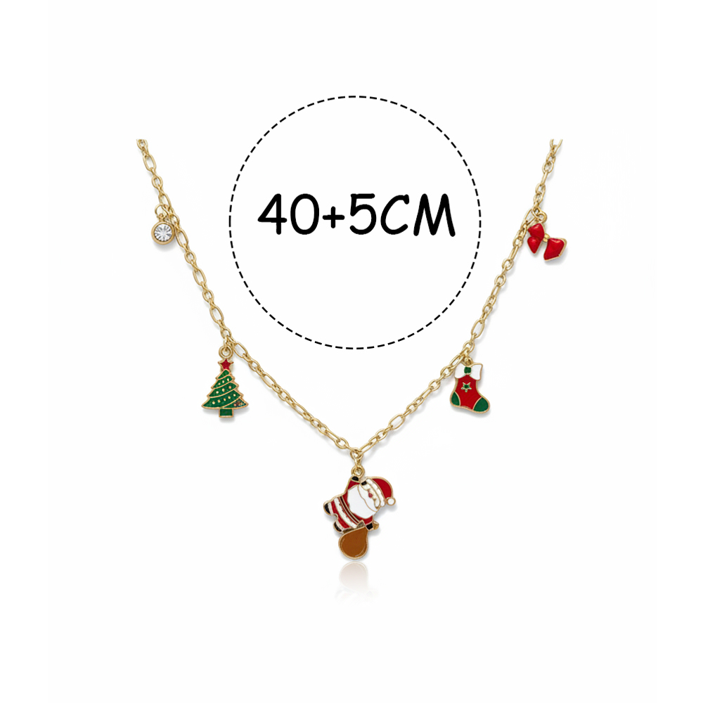 Λαμπερό ατσάλινο κολιέ με γιορτινά charms σε χρυσό χρώμα – Άγιο Βασίλη, χριστουγεννιάτικο δέντρο, κάλτσα και καμπανούλες. Ένα παιχνιδιάρικο και κομψό αξεσουάρ που θα ολοκληρώσει τις γιορτινές σας εμφανίσεις με λάμψη και χαρά. Κατασκευασμένο από ανθεκτικό ανοξείδωτο ατσάλι με χρωματιστές λεπτομέρειες σμάλτου.