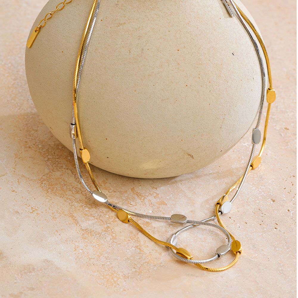 Minimal και κομψό ατσάλινο κολιέ με οβάλ μεταλλικά στοιχεία.Ένα διακριτικό σχέδιο που αναδεικνύει το λαιμό και ταιριάζει ιδανικά με κάθε στυλ.Διατίθεται σε ασημί και χρυσό χρώμα.