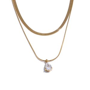 Κομψό διπλό κολιέ από ανοξείδωτο ατσάλι σε χρυσό τόνο, με λεπτές αλυσίδες που αγκαλιάζουν όμορφα το ντεκολτέ και κρεμαστό μοτίφ δάκρυ που χαρίζει διακριτική λάμψη. Minimal αλλά εντυπωσιακό, ιδανικό για καθημερινές και βραδινές εμφανίσεις, φοριέται μόνο του ή σε layering για πιο μοντέρνο αποτέλεσμα.