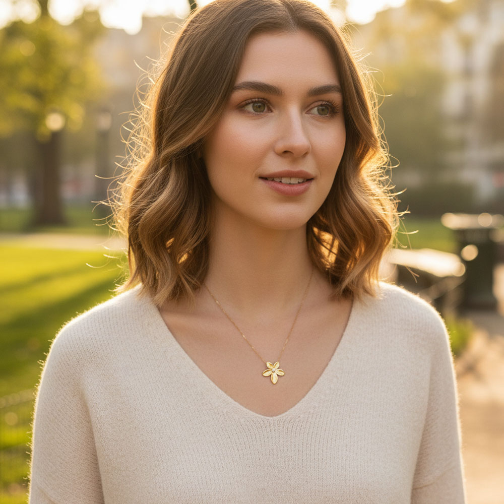 Εντυπωσιακό ατσάλινο κολιέ με χρυσό μενταγιόν σε σχήμα λουλουδιού, διακοσμημένο στο κέντρο με διακριτική πέρλα που χαρίζει κομψότητα και θηλυκότητα. Το minimal design του το καθιστά ιδανικό για κάθε περίσταση — από καθημερινές εμφανίσεις έως πιο ιδιαίτερες εξόδους. Κατασκευασμένο από ανοξείδωτο ατσάλι, ανθεκτικό στο χρόνο και υποαλλεργικό.
