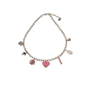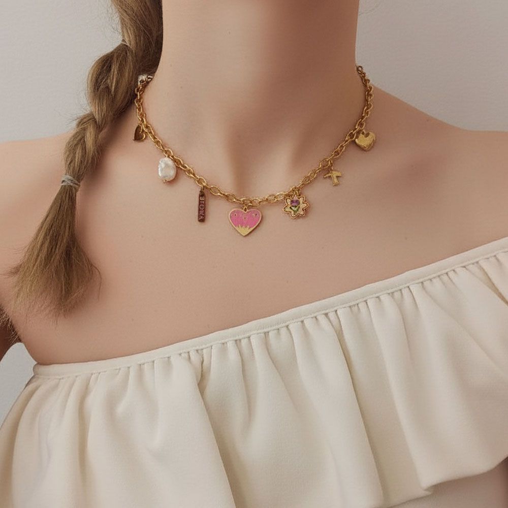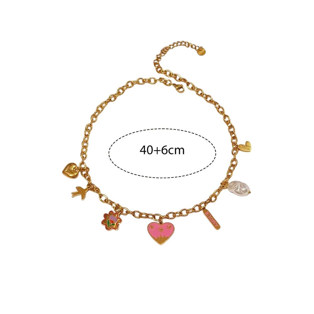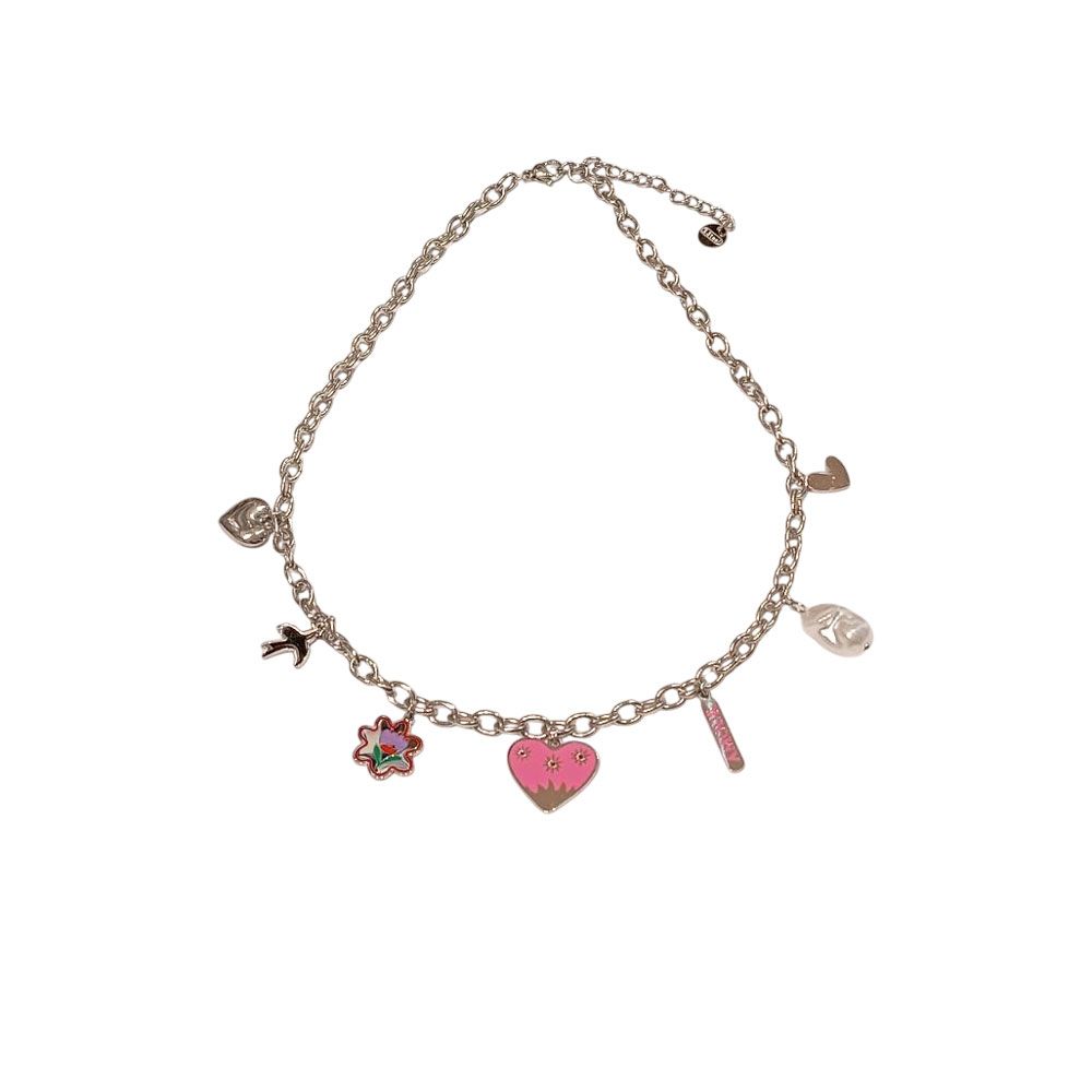Ατσάλινο κολιέ με αλυσίδα σε χρυσή ή ασημί απόχρωση και πολύχρωμα κρεμαστά διακοσμητικά: ροζ καρδιά, λουλούδι, πουλάκι, μαργαριταρένιο charm, καρδιά και μικρά μεταλλικά στοιχεία. Ένα χαρούμενο και νεανικό σχέδιο που συνδυάζει παιχνιδιάρικο στυλ και φρεσκάδα. Μήκος αλυσίδας 40+6cm για άνετη εφαρμογή.