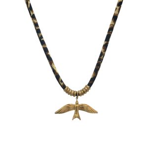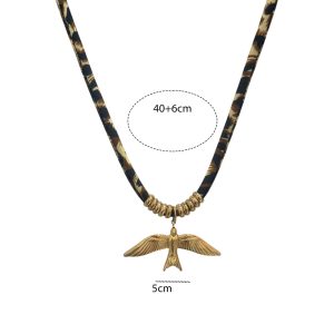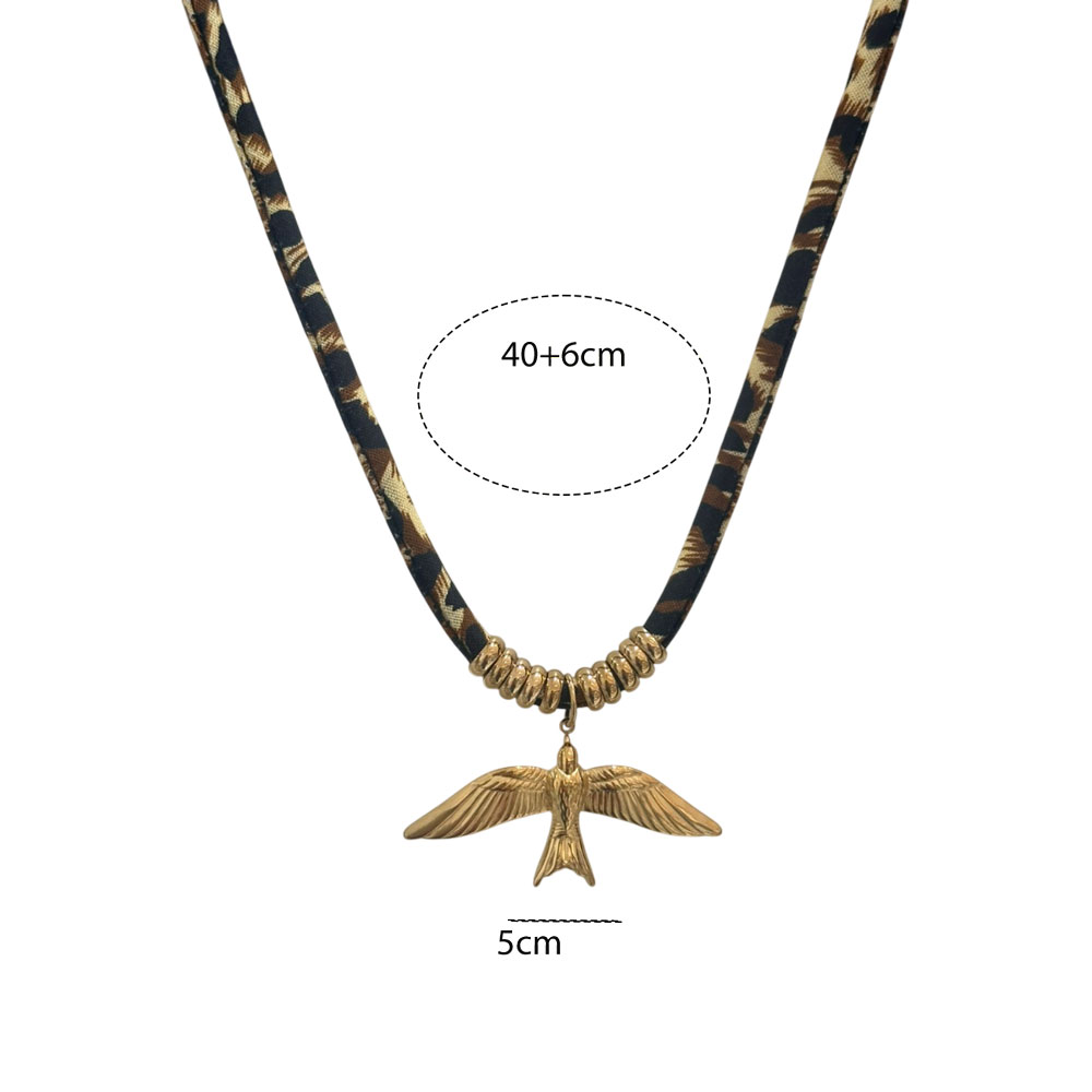 Εντυπωσιακό ατσάλινο κολιέ με μοτίφ πουλιού, ιδανικό για boho και καλοκαιρινές εμφανίσεις. Ο συνδυασμός του υφασμάτινου κορδονιού με τις χρυσές λεπτομέρειες χαρίζει μοναδικό χαρακτήρα και στυλ.Μήκος: 40 + 6 cm