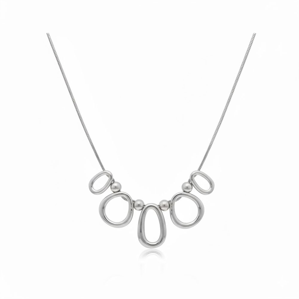 Κομψό ατσάλινο κολιέ με συνδυασμό οβάλ και κυκλικών στοιχείων σε αρμονική διάταξη, που δημιουργεί ένα μοντέρνο και ισορροπημένο αποτέλεσμα. Διαθέτει λεπτή αλυσίδα με προέκταση για ρυθμιζόμενο μήκος και άνετη εφαρμογή. Ιδανικό για να αναβαθμίσει καθημερινές αλλά και πιο ιδιαίτερες εμφανίσεις, φοριέται εύκολα μόνο του ως statement κόσμημα.