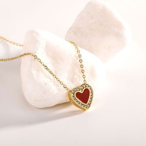 Ατσάλινο Κολιέ Καρδιά με Κόκκινο Σμάλτο & Στρας Χρυσό Χρώμα
