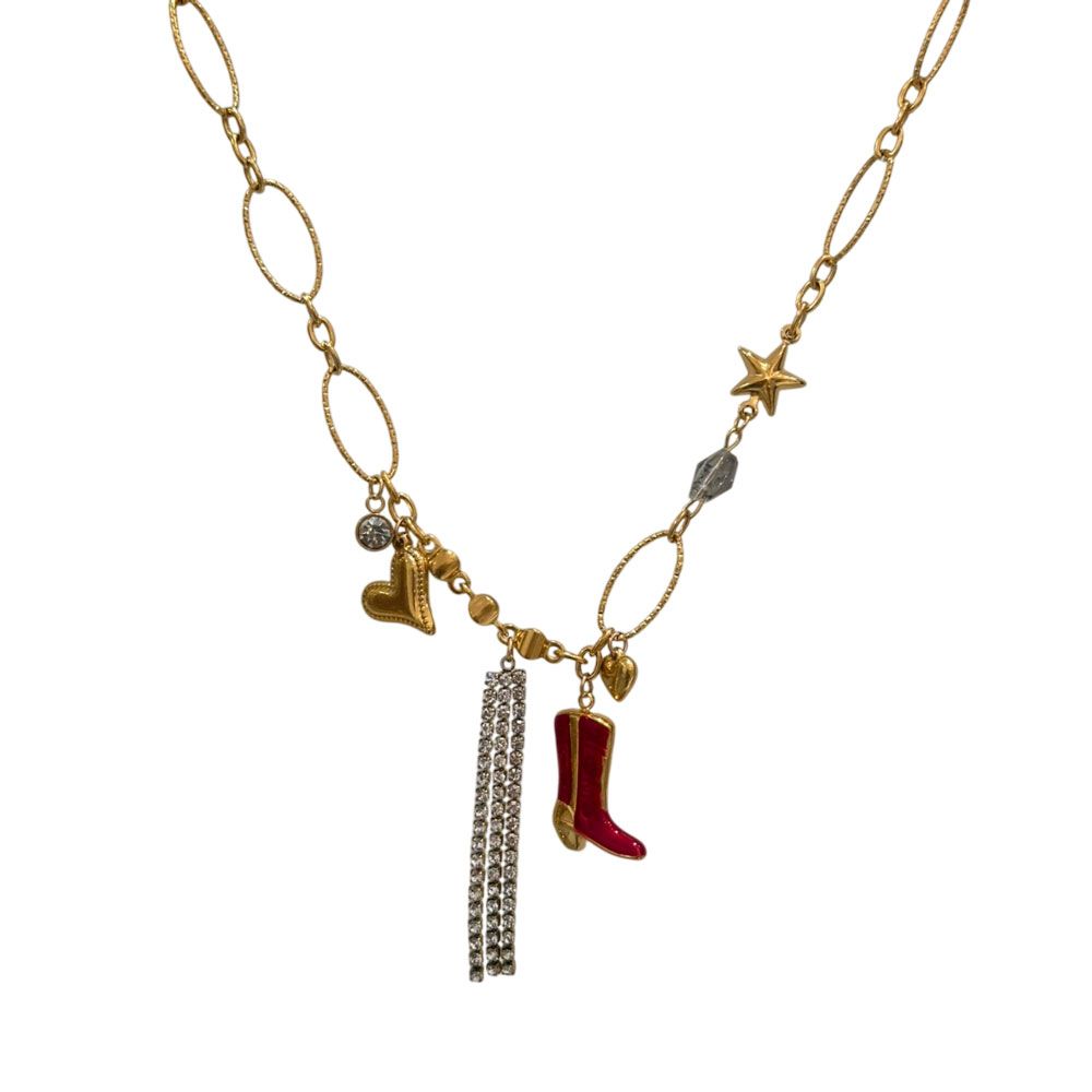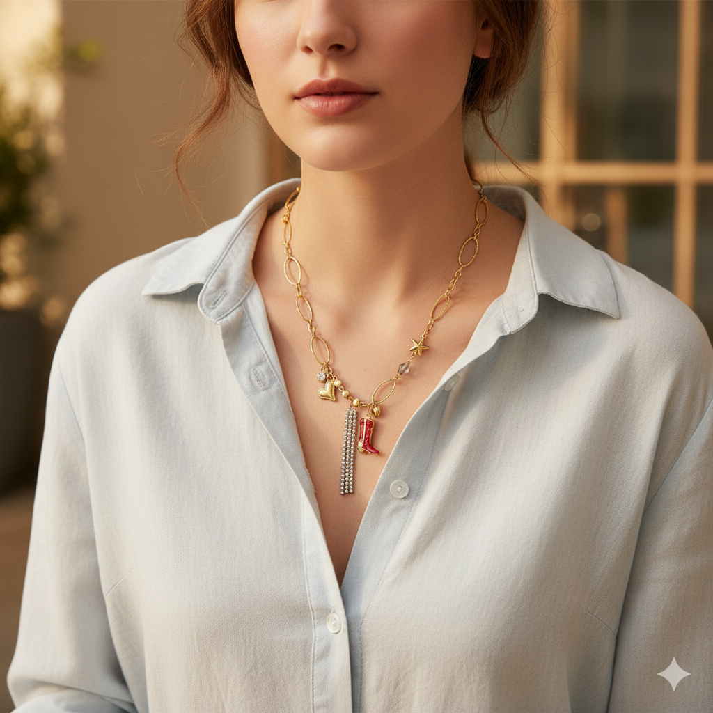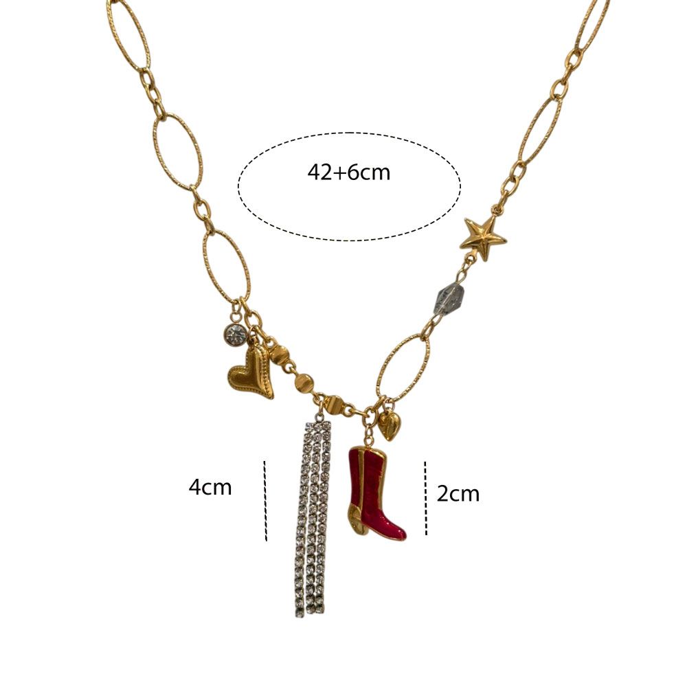 Ατσάλινο κολιέ με χρυσή αλυσίδα και εντυπωσιακά charms — καουμπόικη μπότα, καρδιά, αστέρι και κρυστάλλινες λεπτομέρειες. Ένα παιχνιδιάρικο και ιδιαίτερο κόσμημα που χαρίζει χαρακτήρα σε κάθε εμφάνιση.Μήκος: 42 + 6 cm
